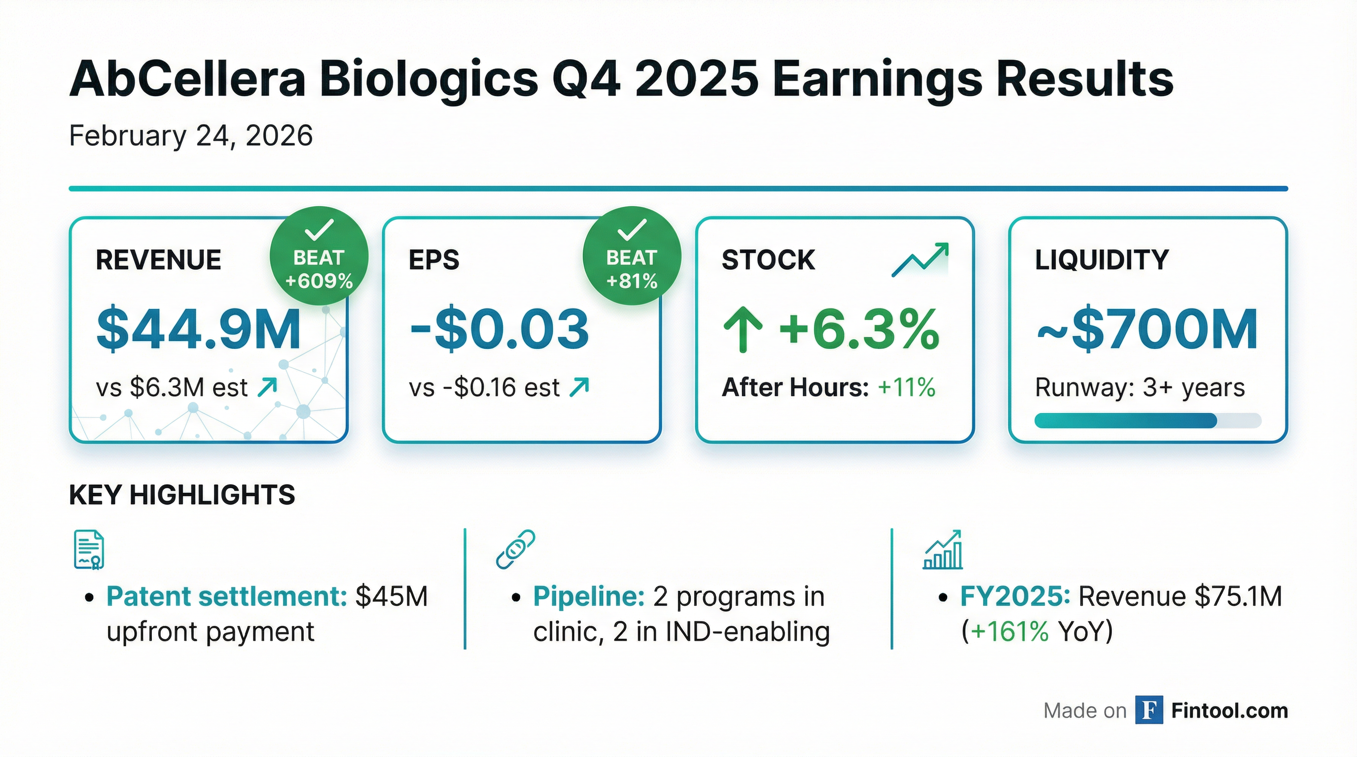 - AbCellera reported $75 million in total revenue for full-year 2025, which included $36 million from settling patent infringement claims, compared to approximately $29 million in 2024. The company also reported a net loss of $146 million, or $0.49 per share, for the year.