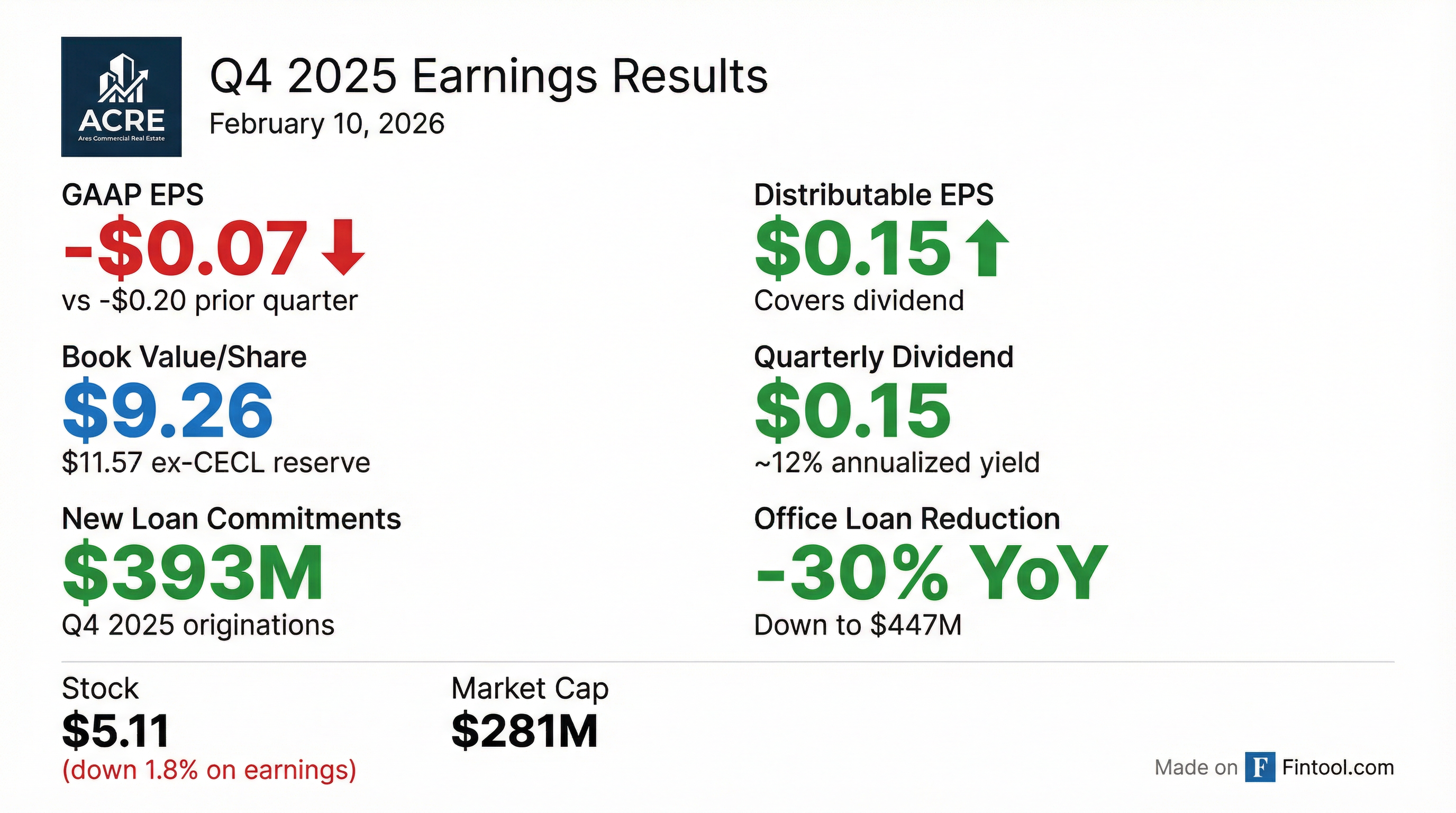 - Ares Commercial Real Estate Corporation (ACRE) reported a GAAP net loss of $(3.9) million or $(0.07) per diluted common share and Distributable Earnings of $8.5 million or $0.15 per diluted common share for the fourth quarter of 2025. For the full year 2025, GAAP net loss was $(0.9) million or $(0.02) per diluted common share, and Distributable Earnings (Loss) was $(6.7) million or $(0.12) per diluted common share.