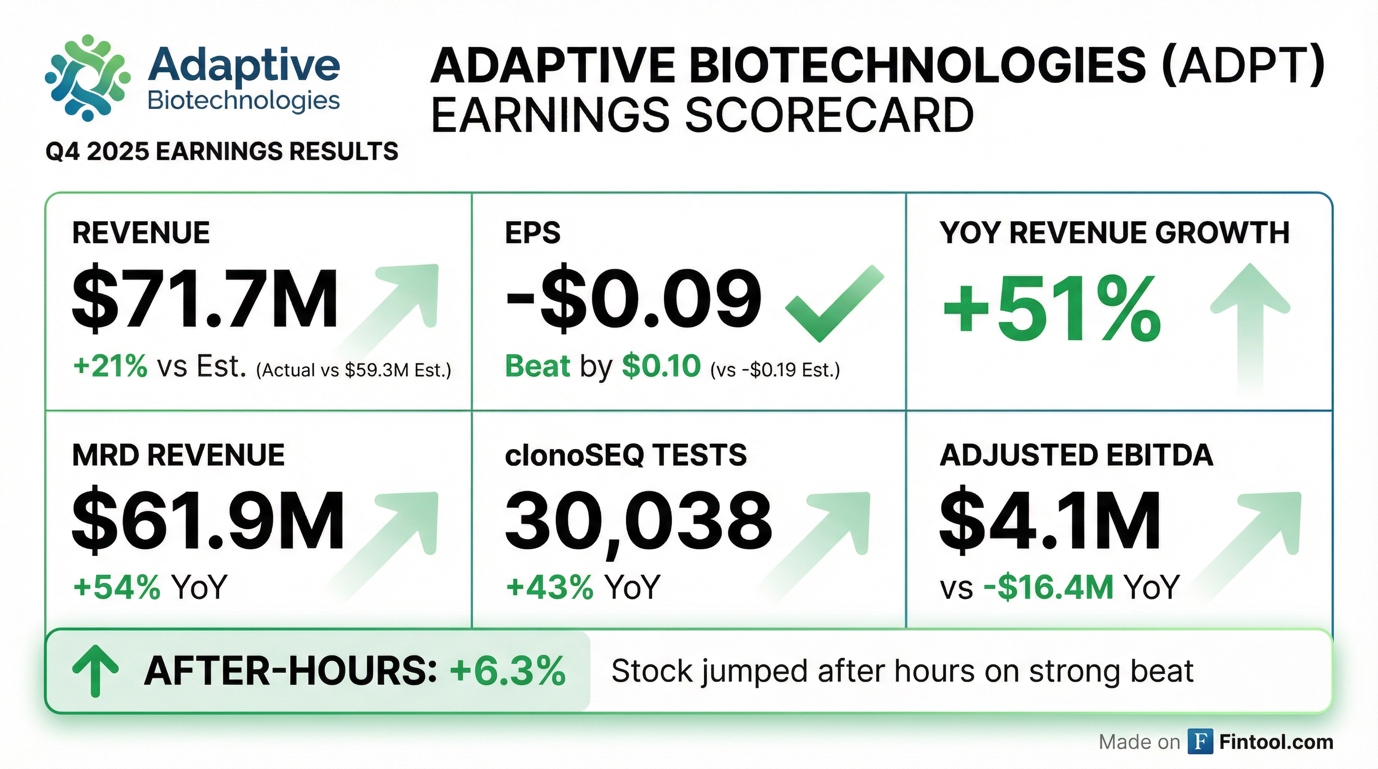 - Adaptive Biotechnologies reported strong financial performance for Q4 and full year 2025, with total revenue reaching $71.7 million in Q4 (up 51% year-over-year) and $277.0 million for the full year (up 55% year-over-year). The MRD business was a key driver, contributing 86% of Q4 revenue and 77% of full year revenue, growing 54% and 46% respectively.
