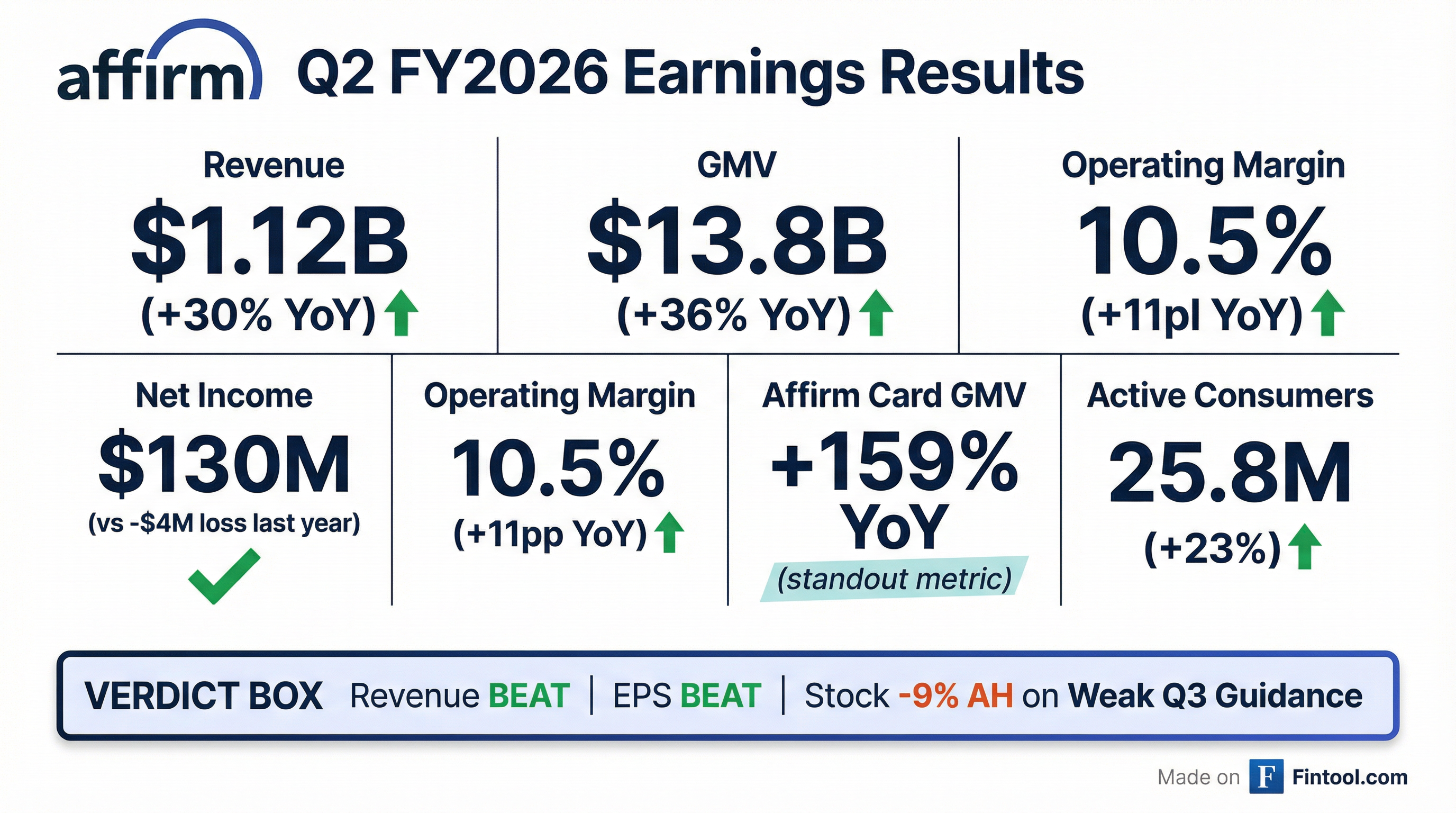 - Affirm Holdings reported revenue of $1,123 million and Gross Merchandise Volume (GMV) of $13.8 billion for FY Q2 2026.