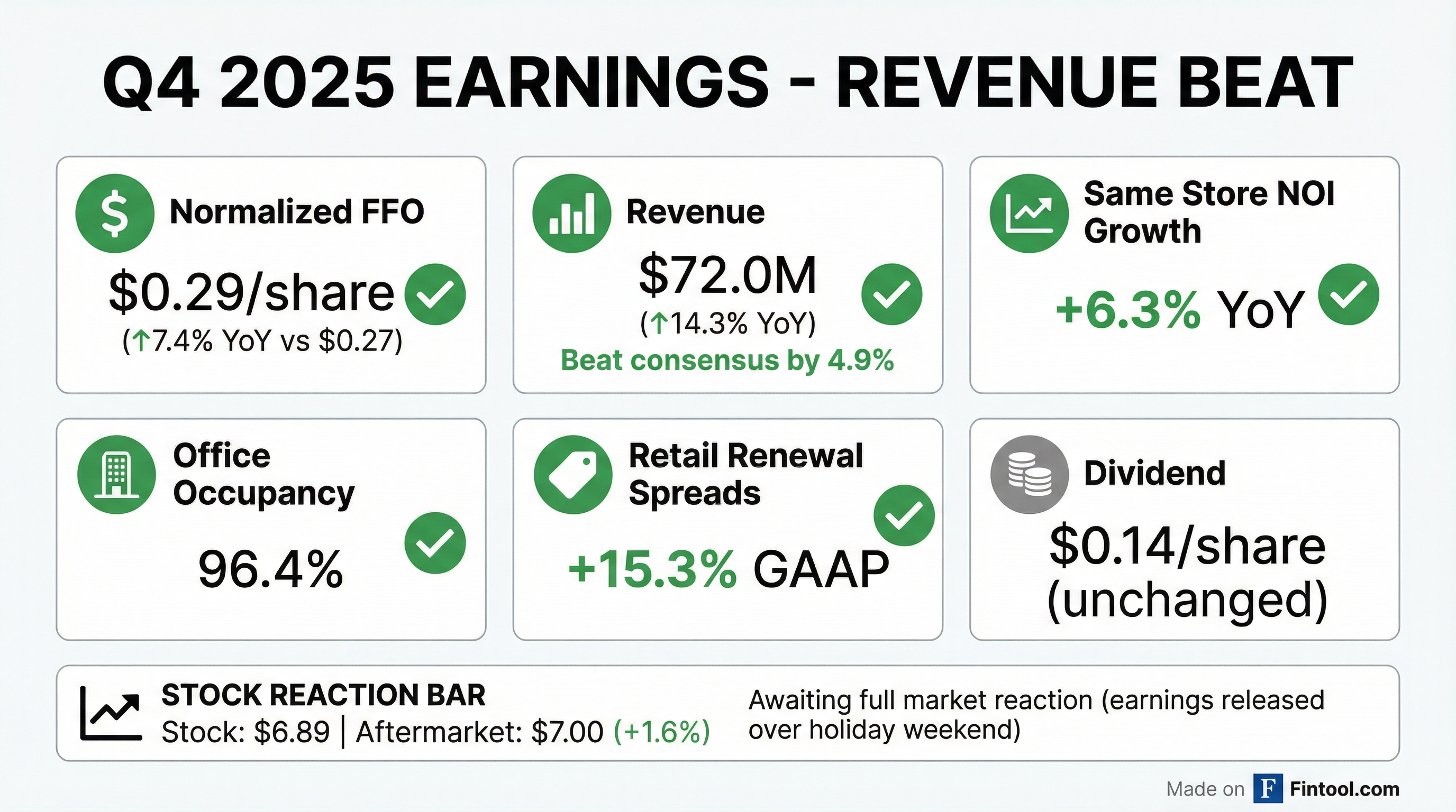 - For Q4 2025, the company reported normalized FFO of $0.29 per diluted share and full-year 2025 normalized FFO of $1.08 per diluted share, both exceeding expectations and guidance.