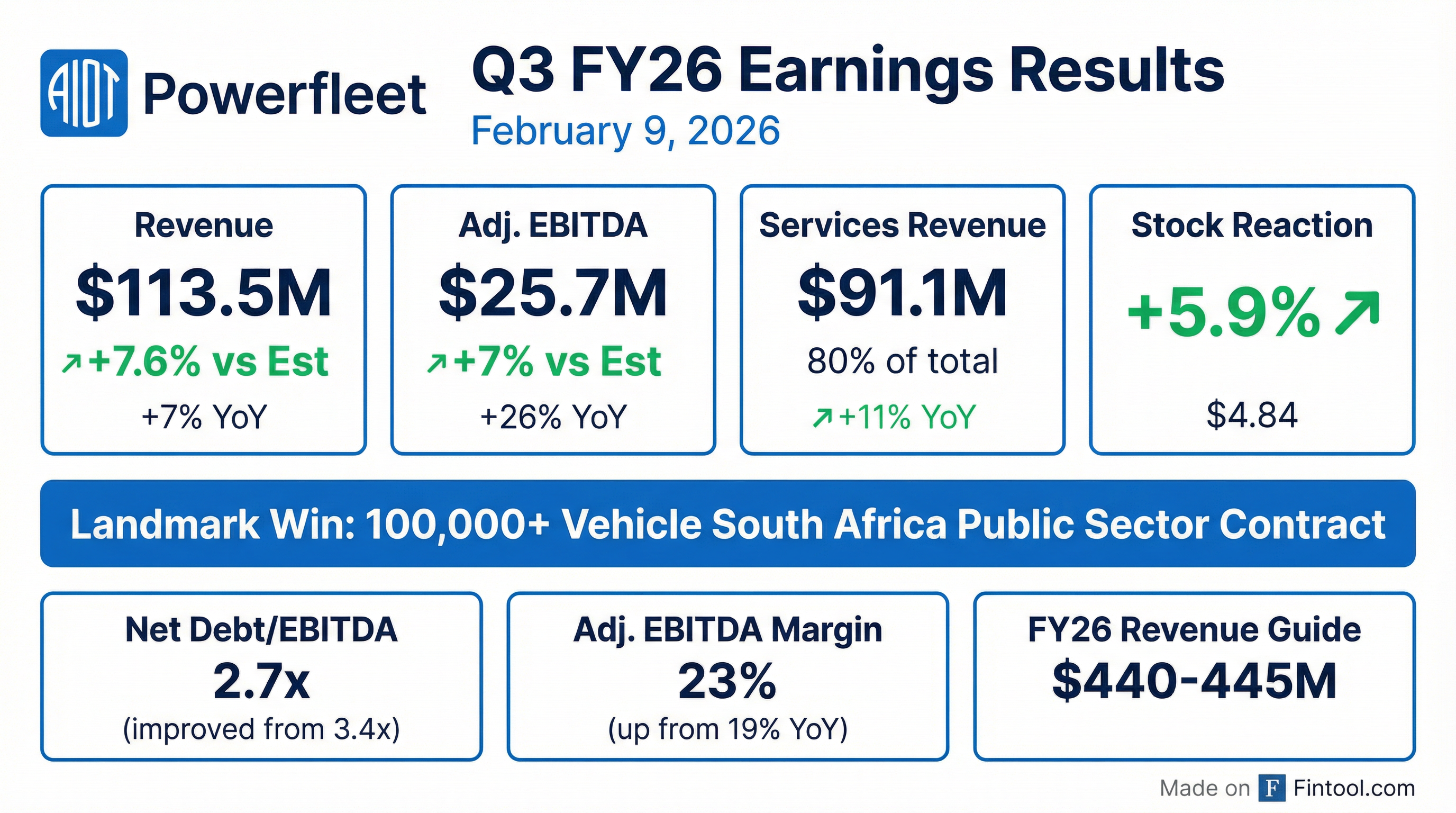 - Powerfleet, Inc. reported Q3 FY26 total revenue of $113.5 million, a 7% year-over-year increase, with services revenue growing 11% to $91.1 million.