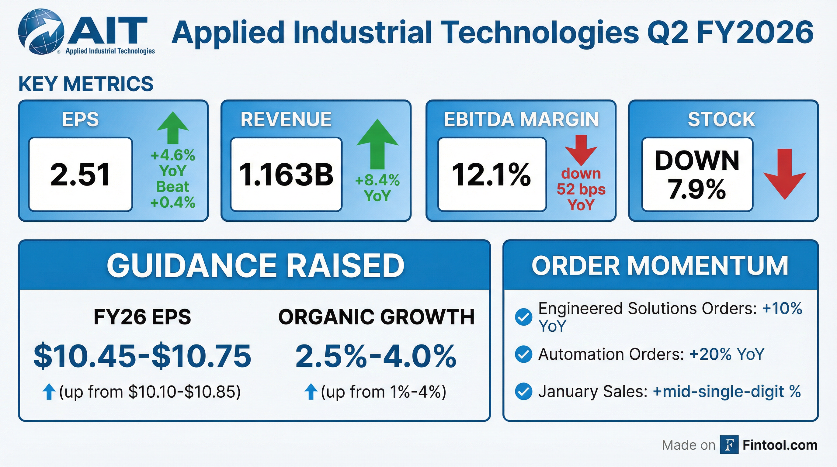 - AIT reported Q2 2026 sales of $1,163 million, an 8.4% increase year-over-year, with organic sales up 2.2%. Net Income was $95.3 million, and EPS increased 4.6% year-over-year to $2.51.