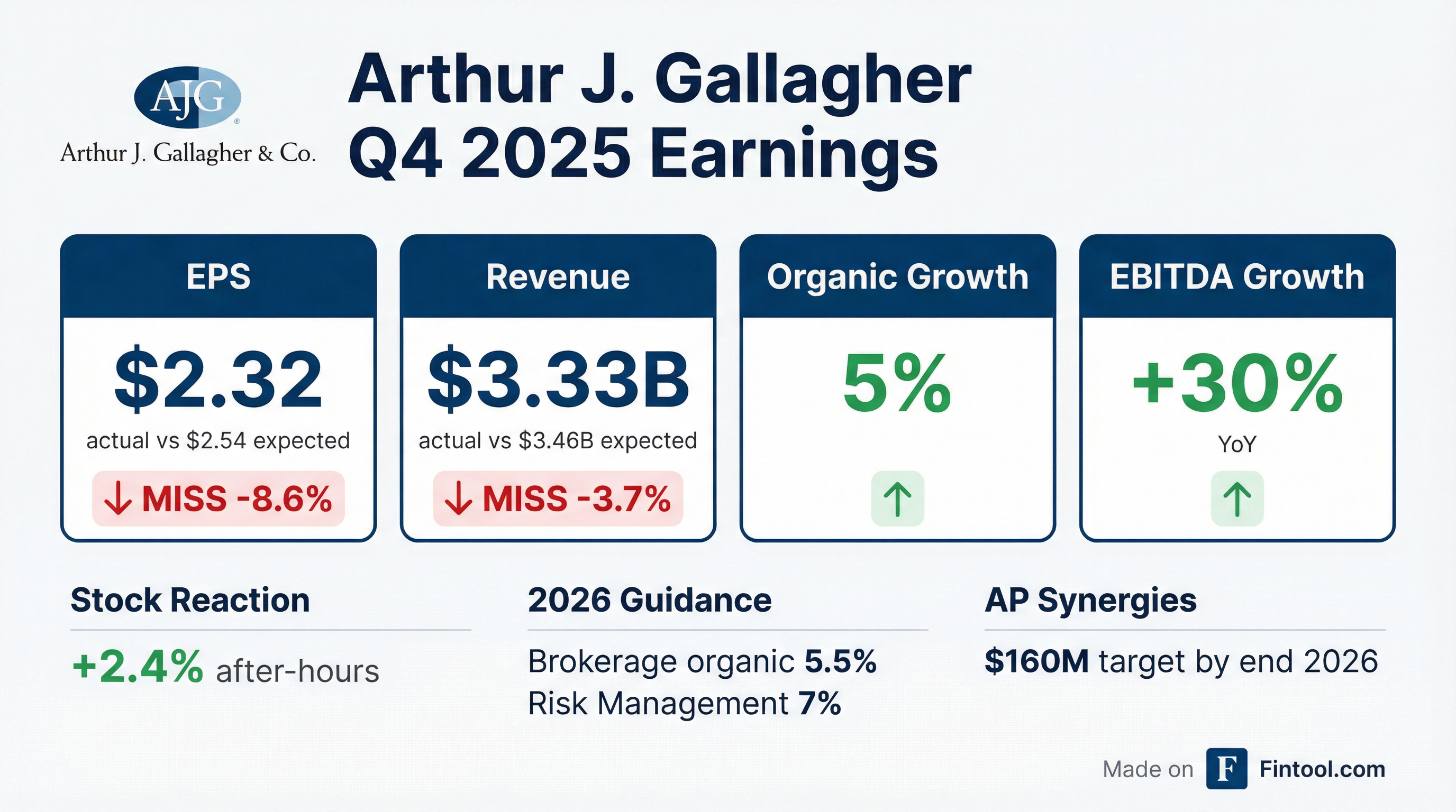 - Arthur J. Gallagher & Co. delivered >30% Q4 revenue growth, including 5% organic growth; adjusted EBITDA rose 30%, with brokerage segment revenue up 38% (organic 5%) and adjusted EBITDA margin of 32.2% (+50 bps).