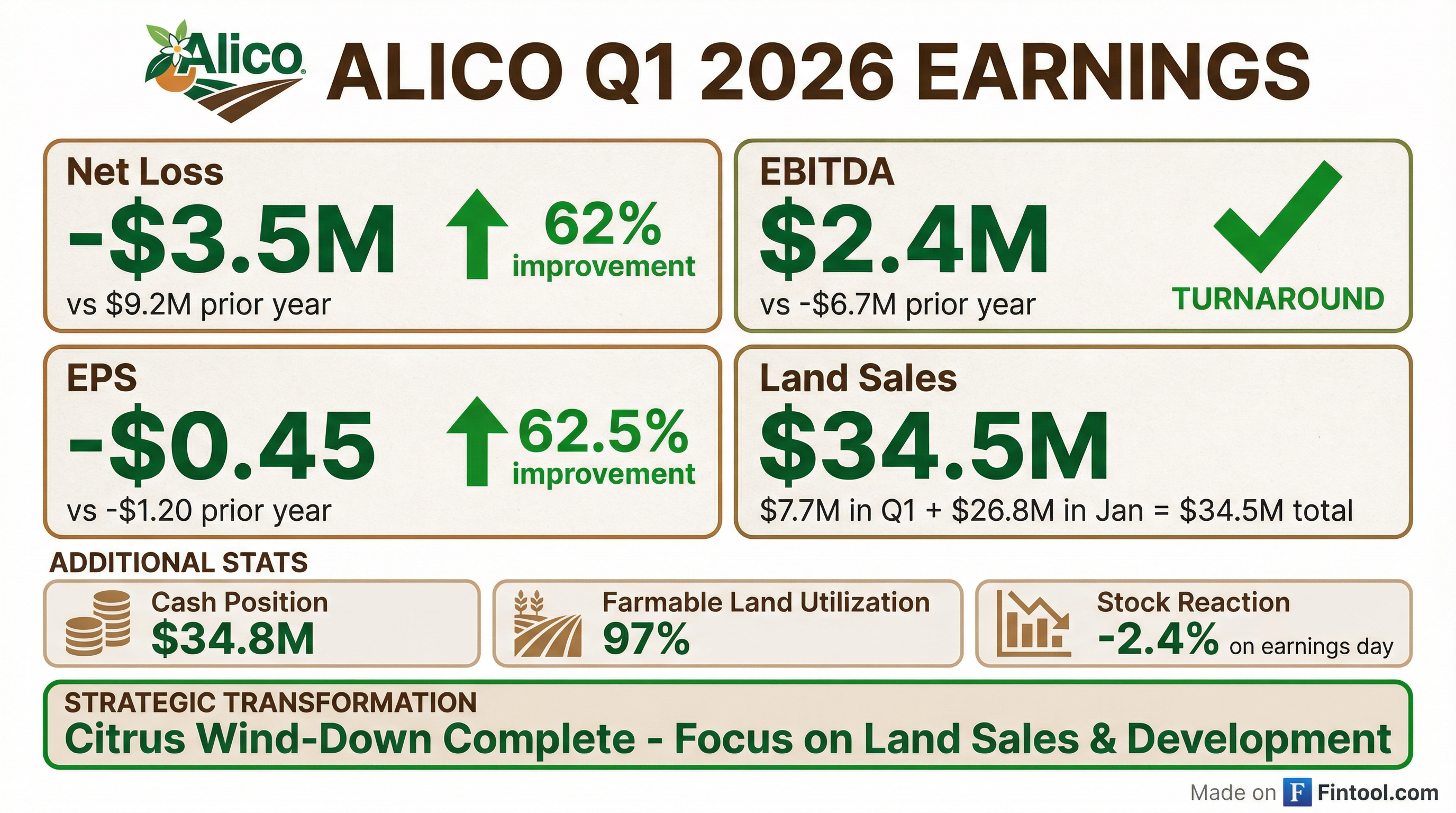 - Alico reported a net loss of $3.5 million or $0.45 per diluted share for Q1 2026, a significant improvement from a $9.2 million loss in the prior year, and achieved positive EBITDA of $2.4 million compared to -$6.7 million in the prior year period. Total revenue for the quarter was $1.9 million, primarily reflecting the substantial conclusion of its citrus business.