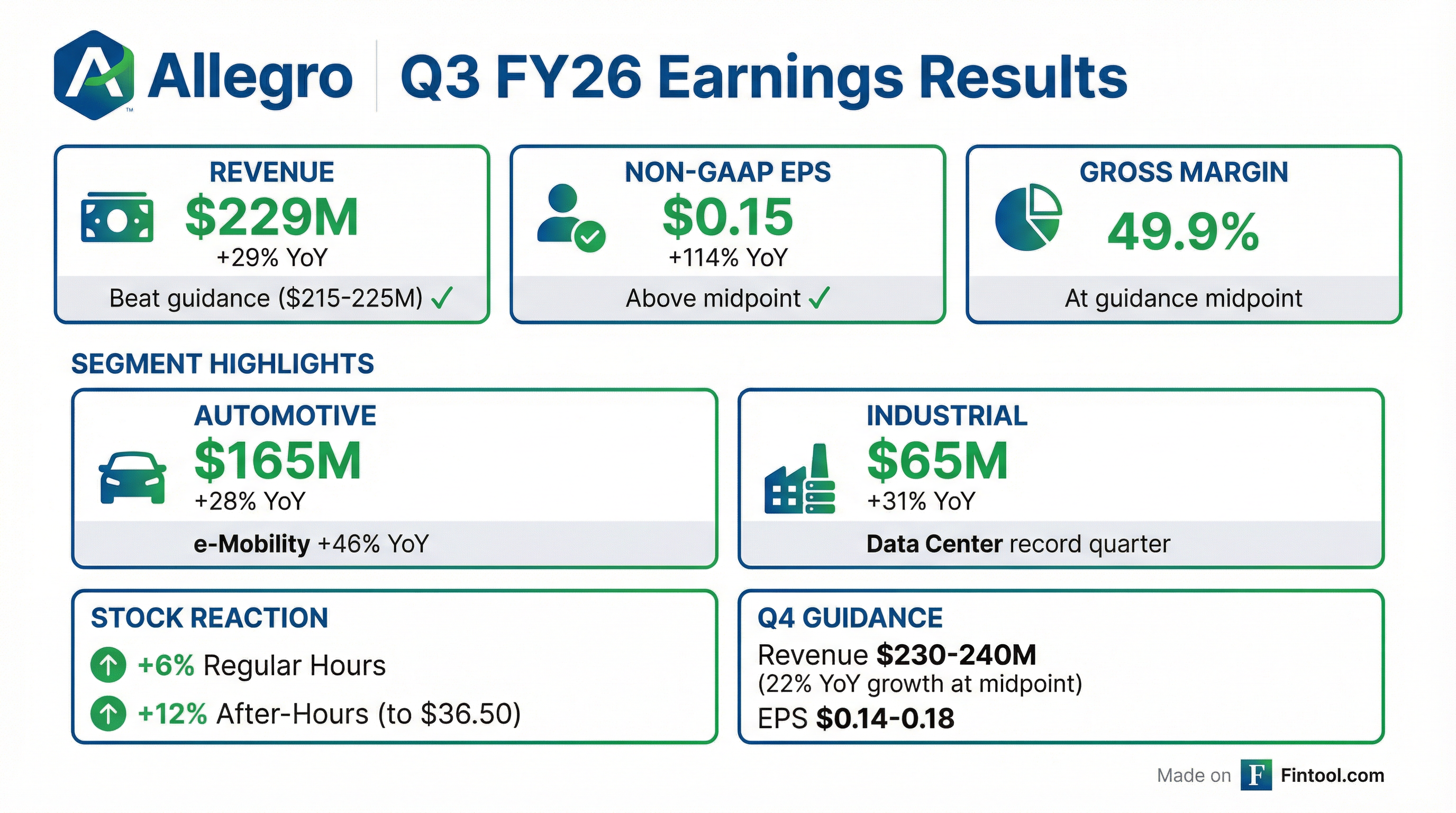 - Allegro MicroSystems reported net sales of $229 million and non-GAAP earnings per share of $0.15 for Q3 2026, representing 29% year-over-year sales growth and 114% year-over-year EPS growth.