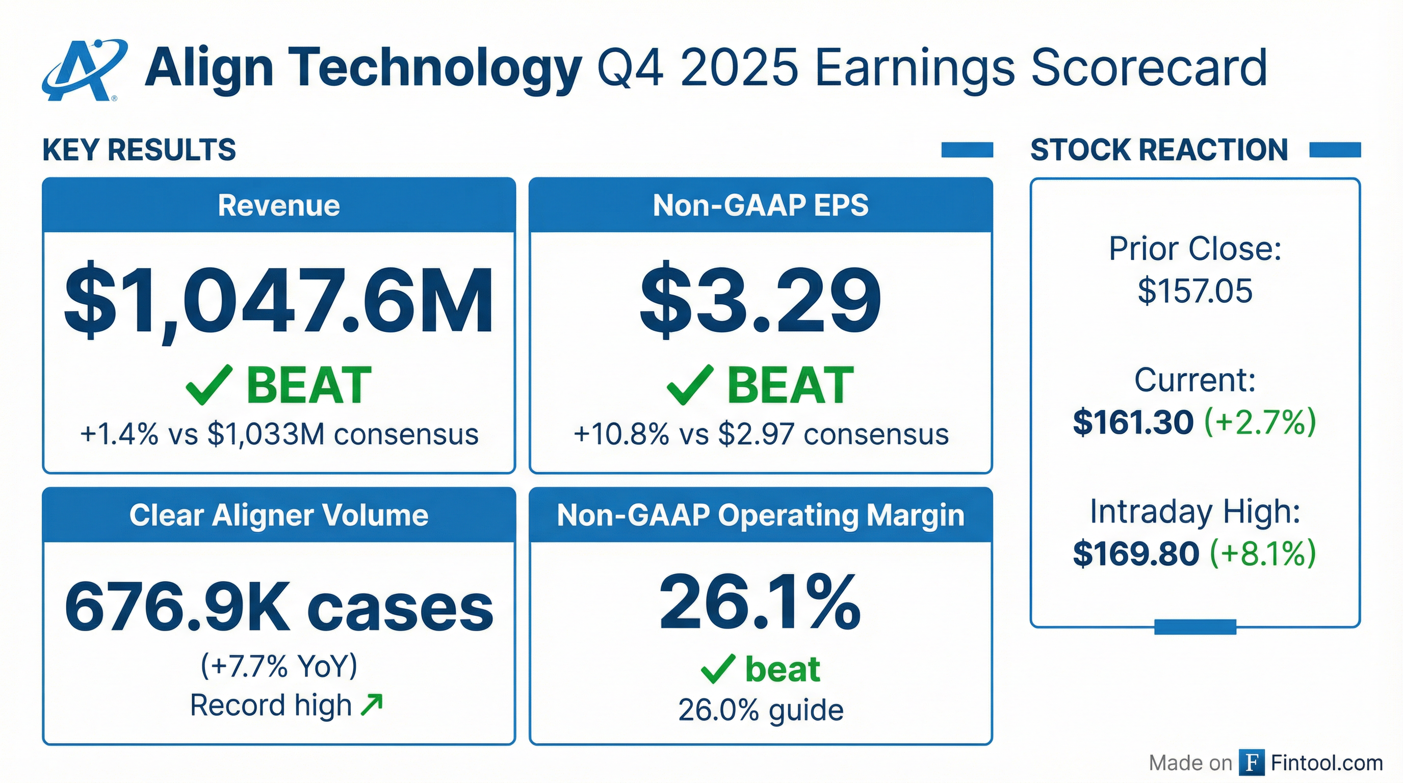 - Record Q4’25 total revenues of $1,047.6 M (up 5.3% YoY), driven by clear aligner revenues of $838.1 M and 676.9 K aligner cases shipped (up 7.7% YoY).