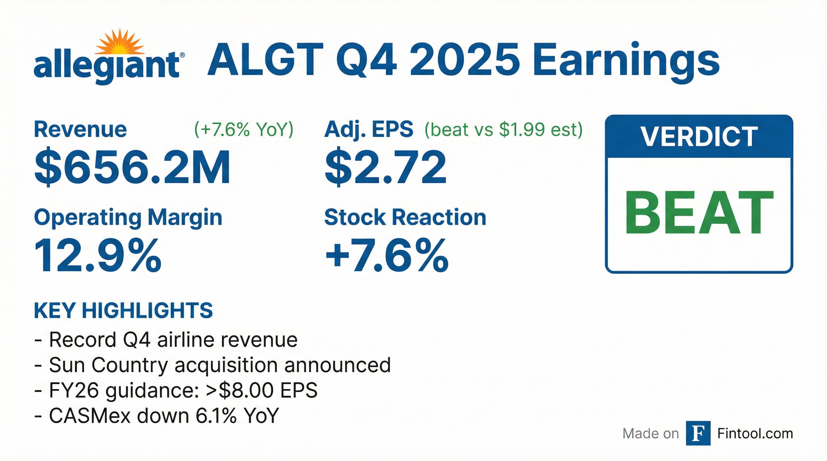 - Allegiant Travel Company reported strong Q4 2025 financial results, with total airline revenue of $656 million, up 7.6% year-over-year, and an adjusted operating margin of 12.9%. Airline-only earnings per share reached $2.72, exceeding the guided midpoint of $2.