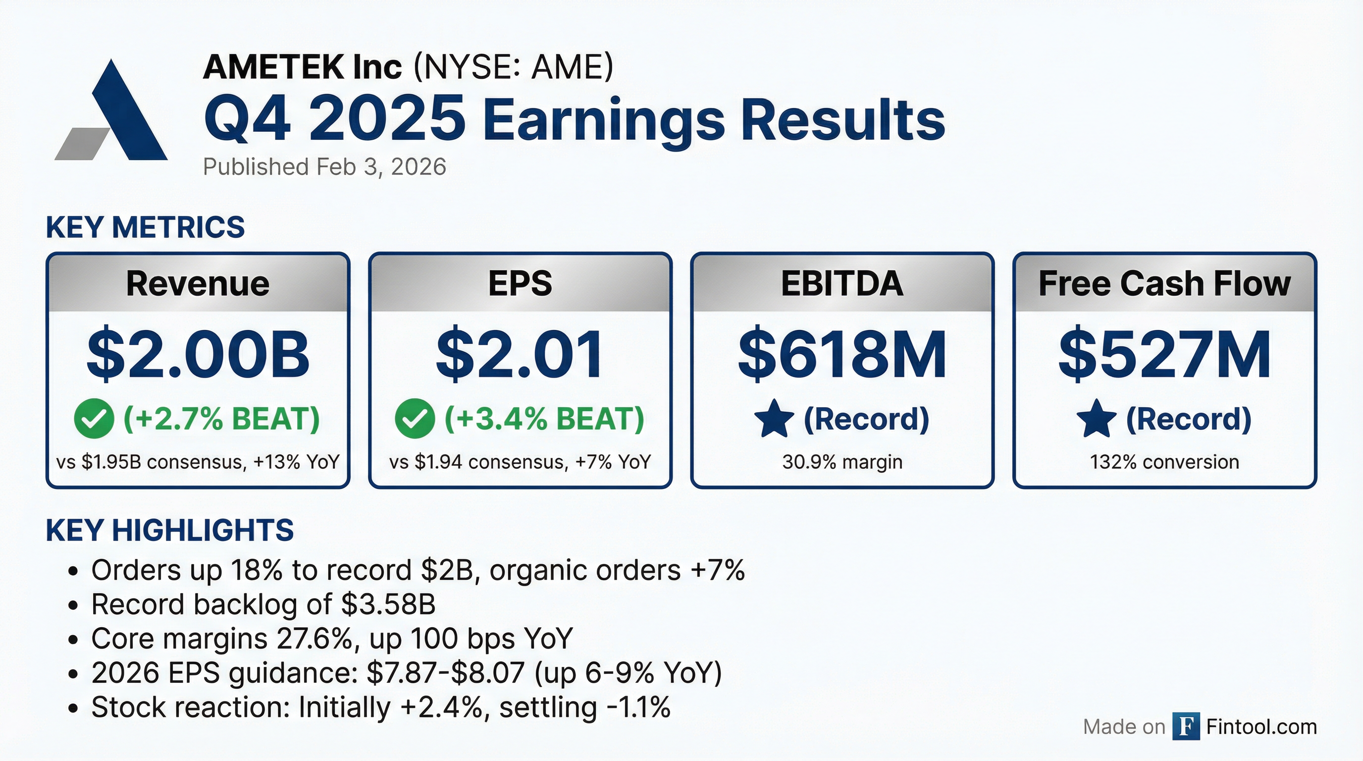 - AMETEK’s Q4 2025 sales reached $2.0 billion, up 13% year-over-year; GAAP EPS was $1.73, while adjusted EPS rose 7% to $2.01.