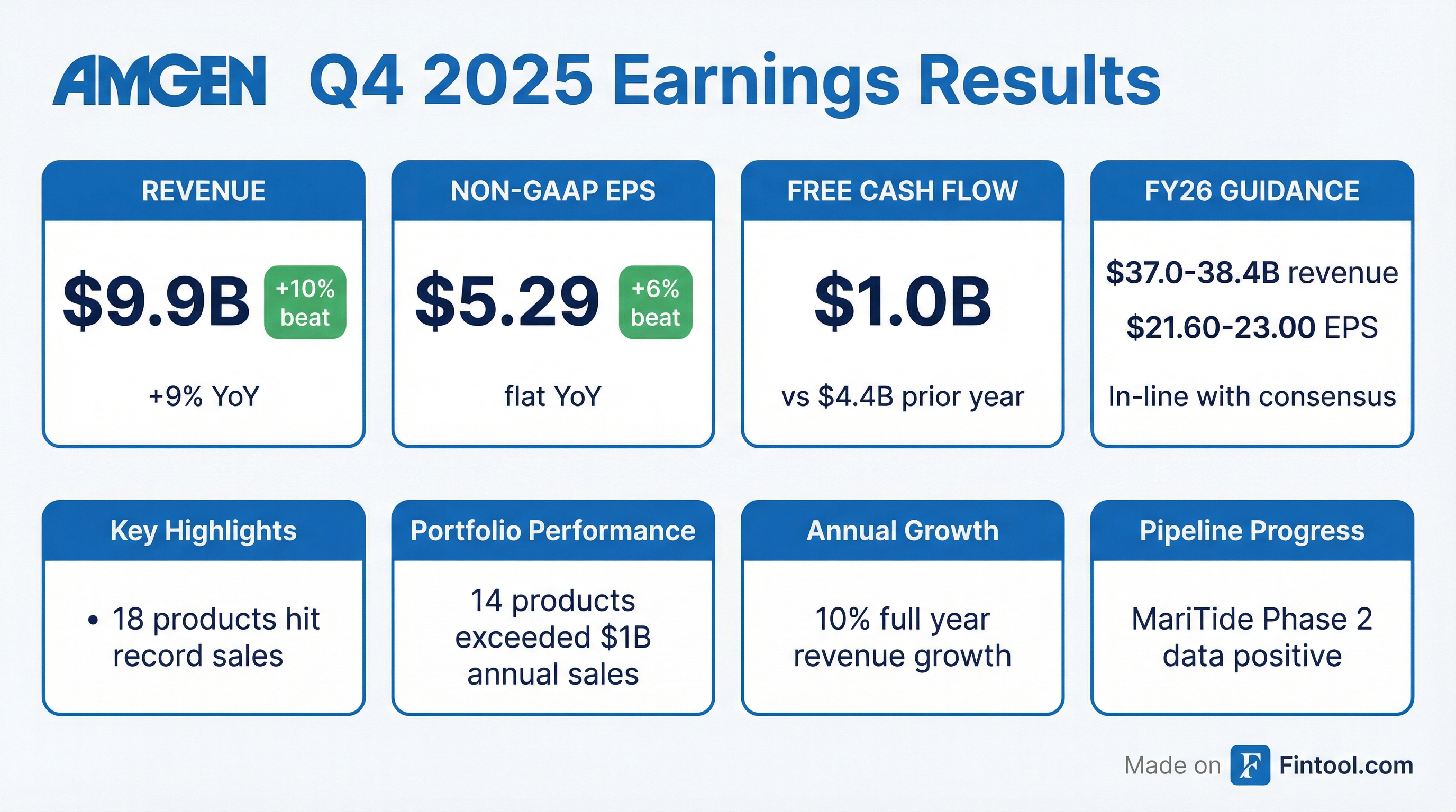 - Amgen delivered Q4 2025 total revenues of $9.9 billion (+9% YoY) and full year revenues of $36.8 billion (+10% YoY); GAAP EPS rose to $2.45 in Q4 (+111% YoY) and $14.23 for FY 2025 (+88% YoY).
