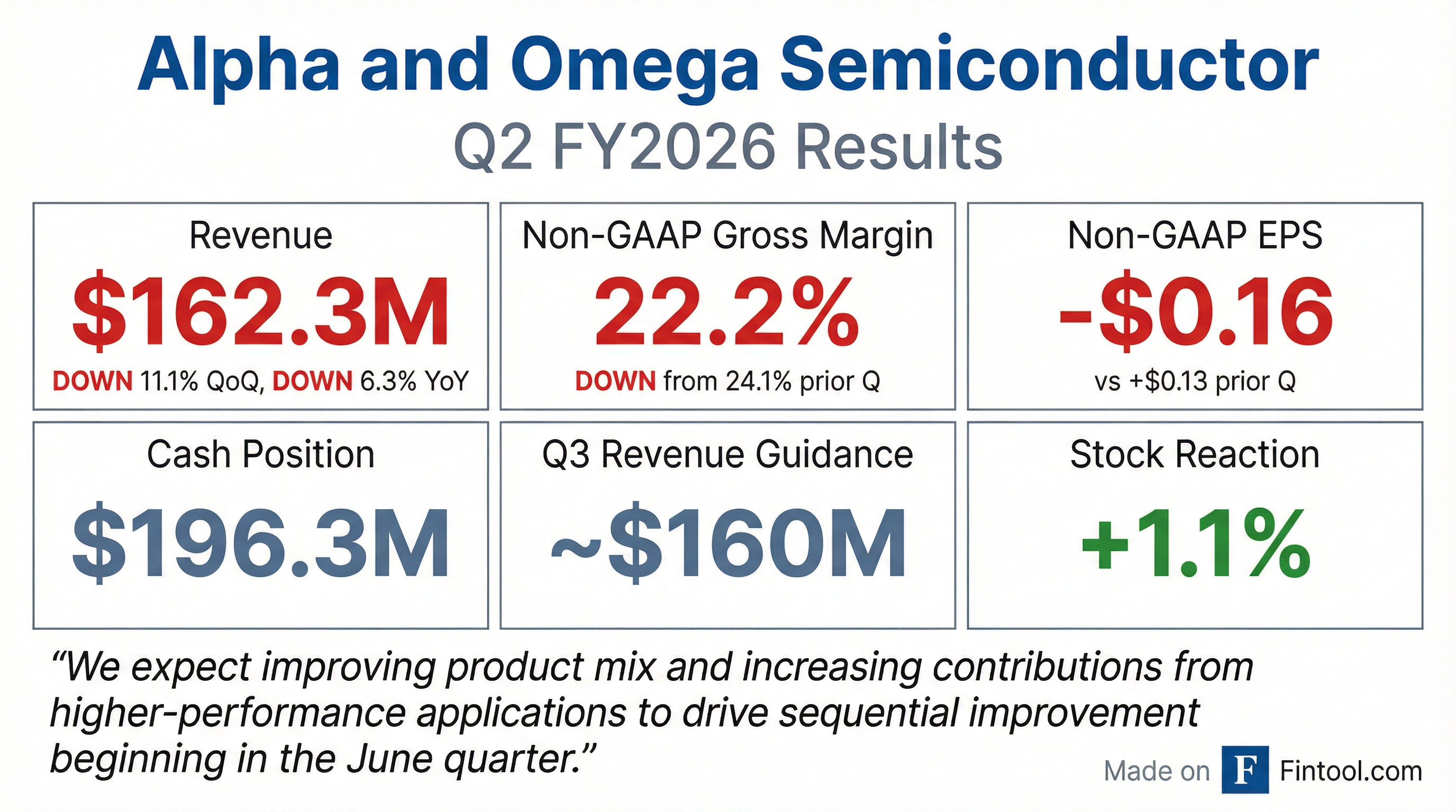 - Alpha and Omega Semiconductor reported Q2 2026 revenue of $162.3 million and a non-GAAP EPS loss of $0.16 per share, with a non-GAAP gross margin of 22.2%.