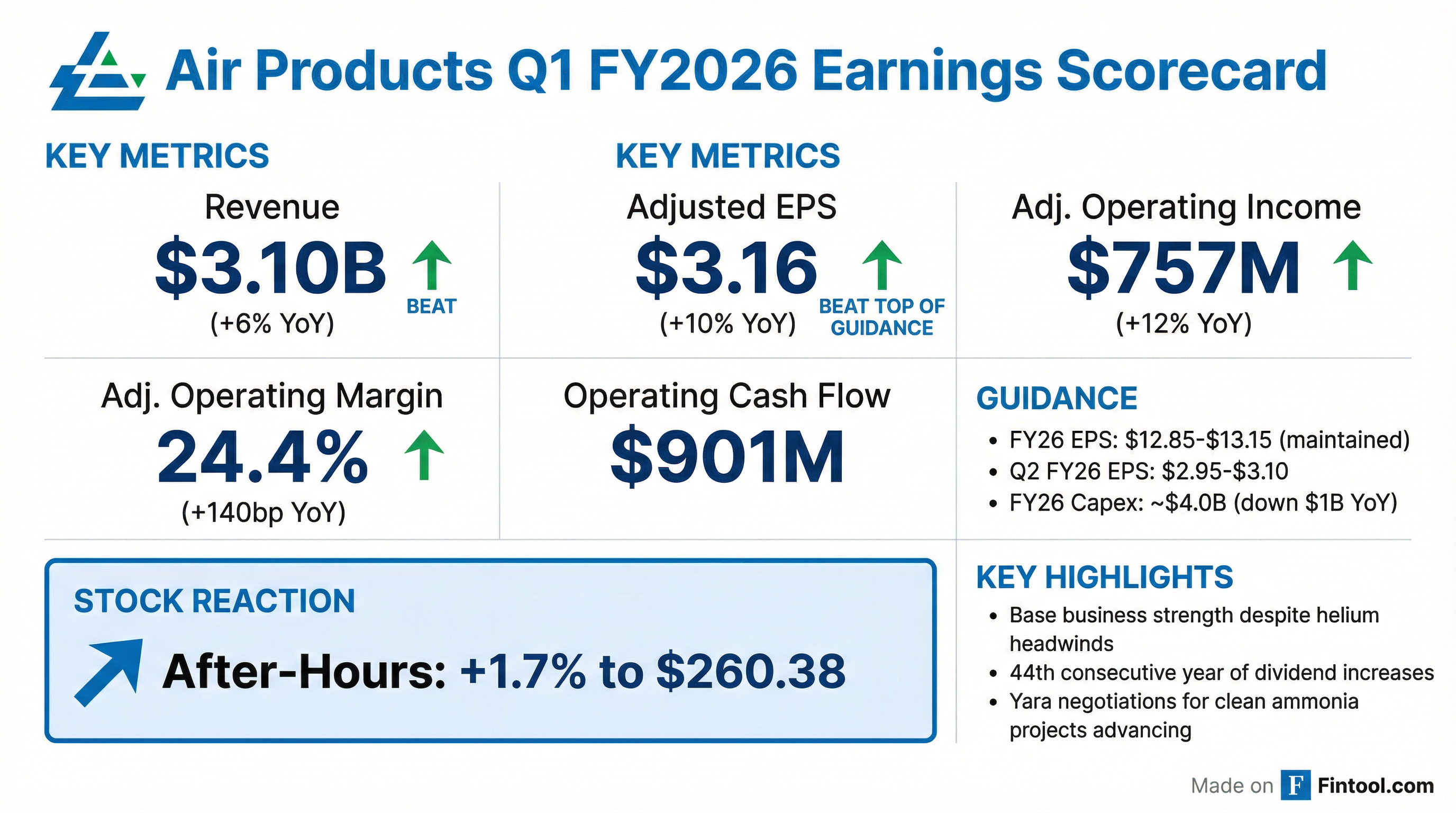 - Air Products delivered Q1 FY26 GAAP EPS of $3.04 (up 10%) and adjusted EPS of $3.16 (up 10%) on $3.1 billion in sales (up 6%)