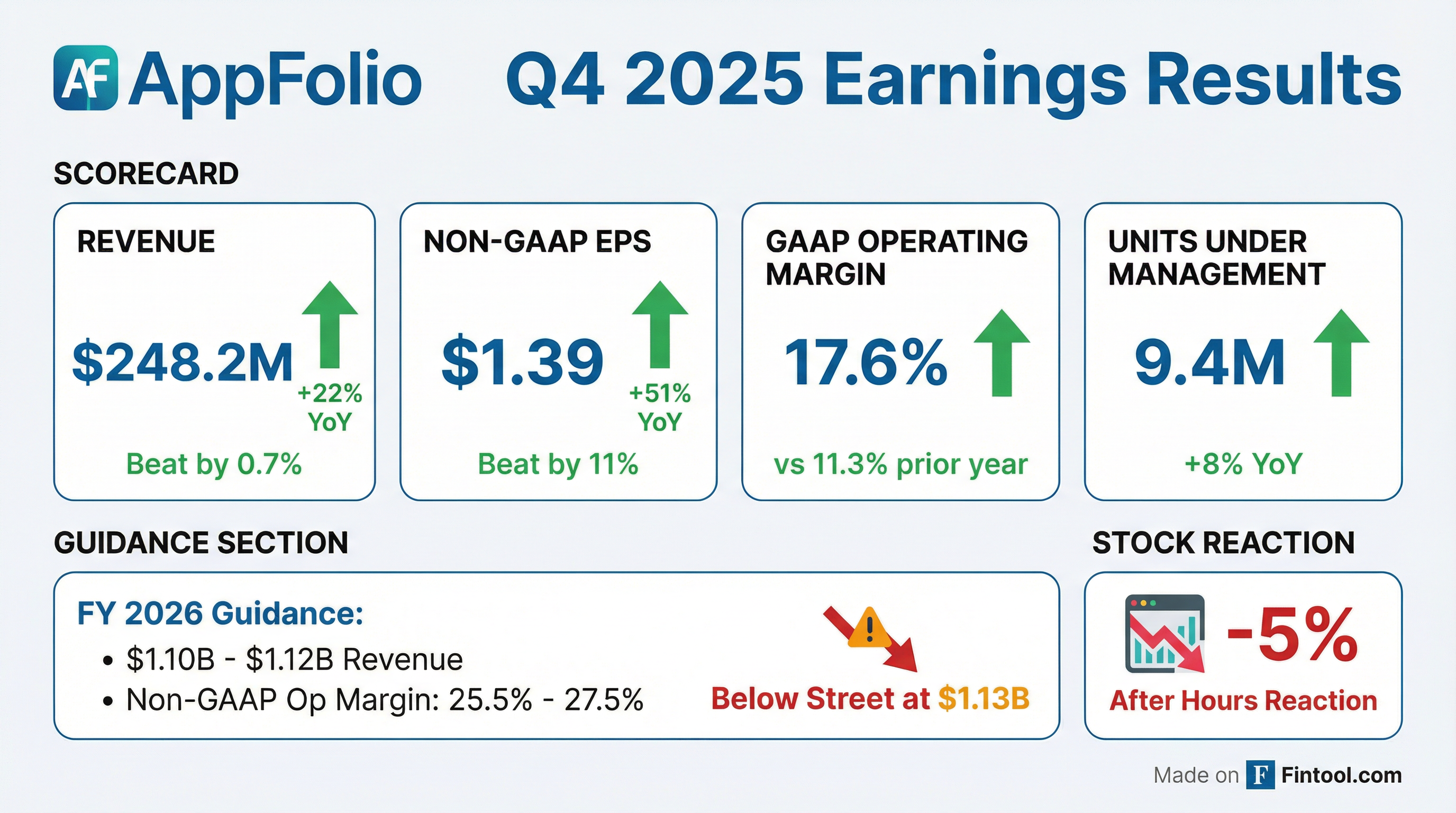 - AppFolio reported Q4 2025 revenue of $248 million, a 22% year-over-year increase, and full-year 2025 revenue of $951 million, representing 20% year-over-year growth.
