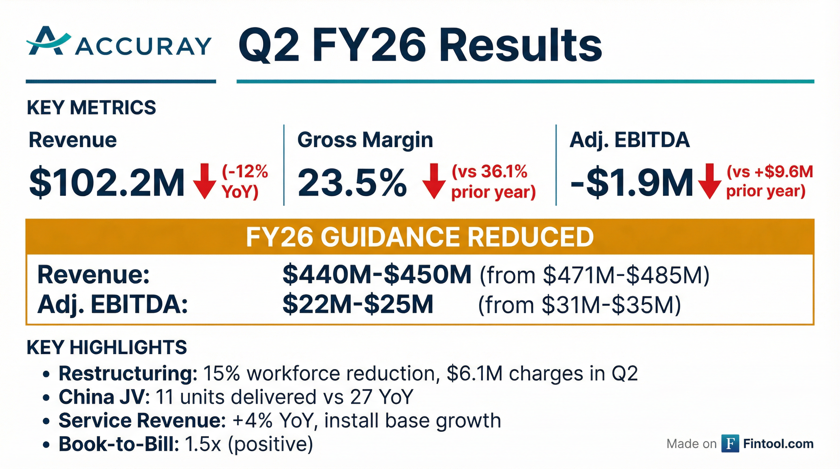 - Accuray revised its fiscal year 2026 guidance, lowering revenue expectations to $440-$450 million (from $471-$485 million) and Adjusted EBITDA to $22-$25 million (from $31-$35 million), attributing the change to continued volatility in China and persistent tariffs.