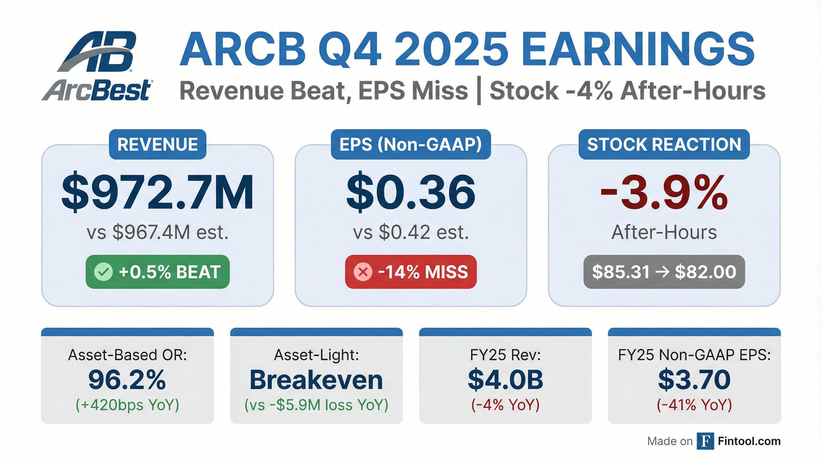- ArcBest reported Q4 2025 consolidated revenue of $973 million, a 3% year-over-year decrease, with non-GAAP operating income of $14 million and adjusted non-GAAP EPS of $0.36.