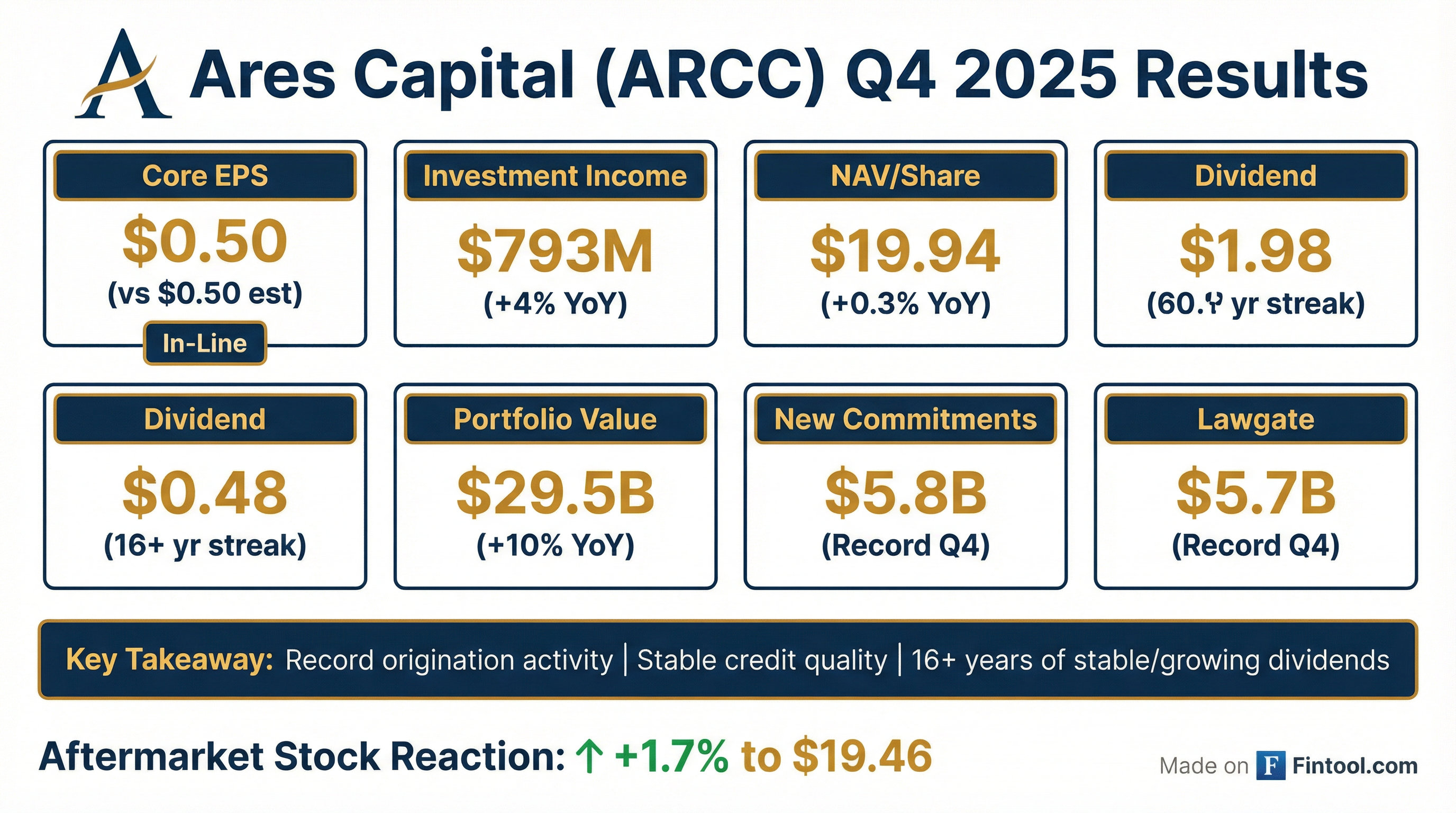 - ARCC reported Q4 2025 core earnings per share of $0.50 and full-year 2025 core earnings per share of $2.01, both fully covering dividends and contributing to an ROE exceeding 10% for the quarter and year. The company maintains a strong dividend outlook, supported by over 2 quarters of spillover income.