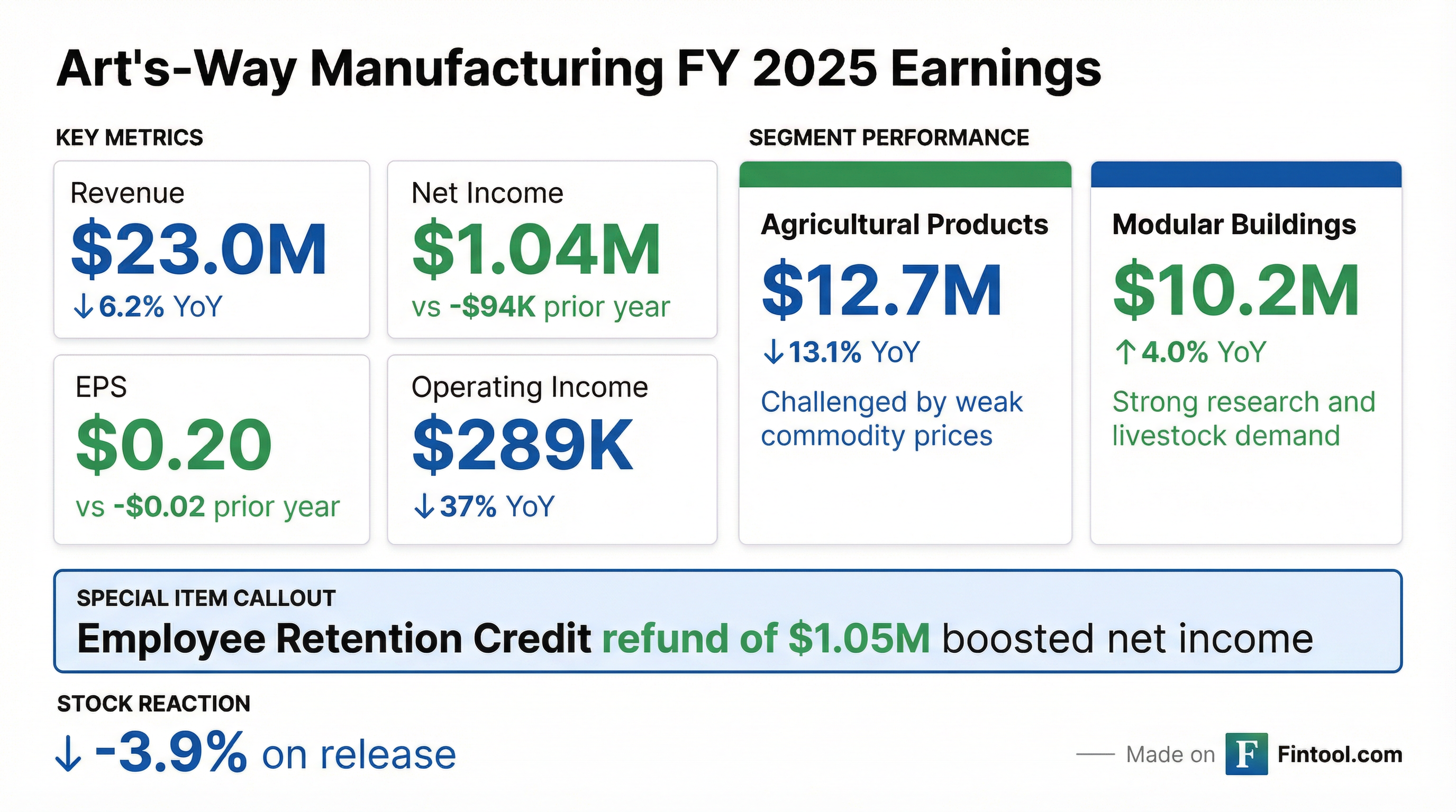 - Art's Way Manufacturing Co., Inc. (ARTW) reported fiscal 2025 sales of $22,975,000, a 6.2% decrease from fiscal 2024, but achieved net income of $1,035,000 or $0.20 EPS, a significant improvement from a net loss of $(94,000) or $(0.02) EPS in fiscal 2024.