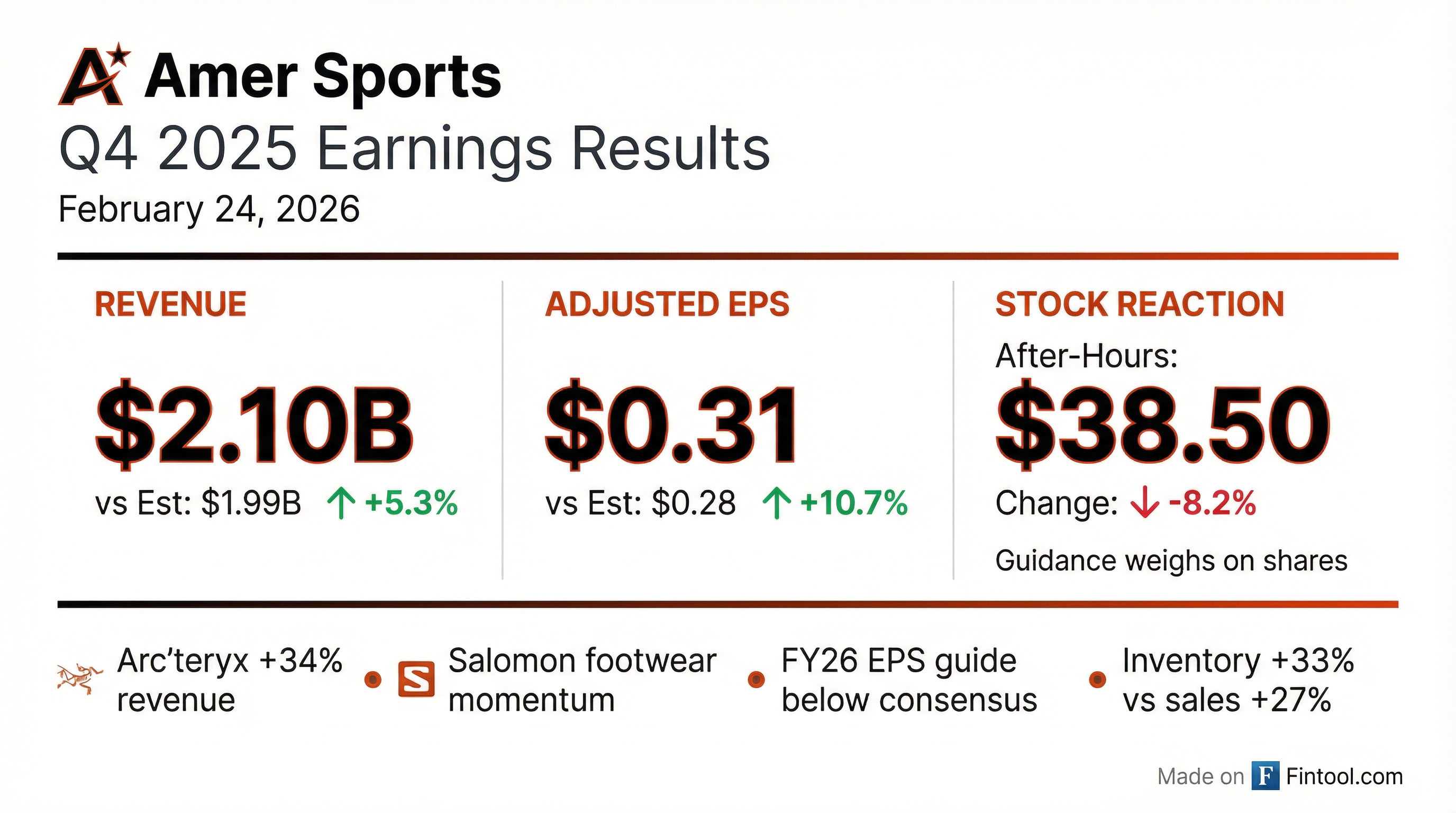 - Amer Sports reported strong Q4 2025 sales growth of 28% on a reported basis and adjusted diluted EPS of $0.31, contributing to a 27% group growth and 12.8% adjusted operating margin for the full year 2025.