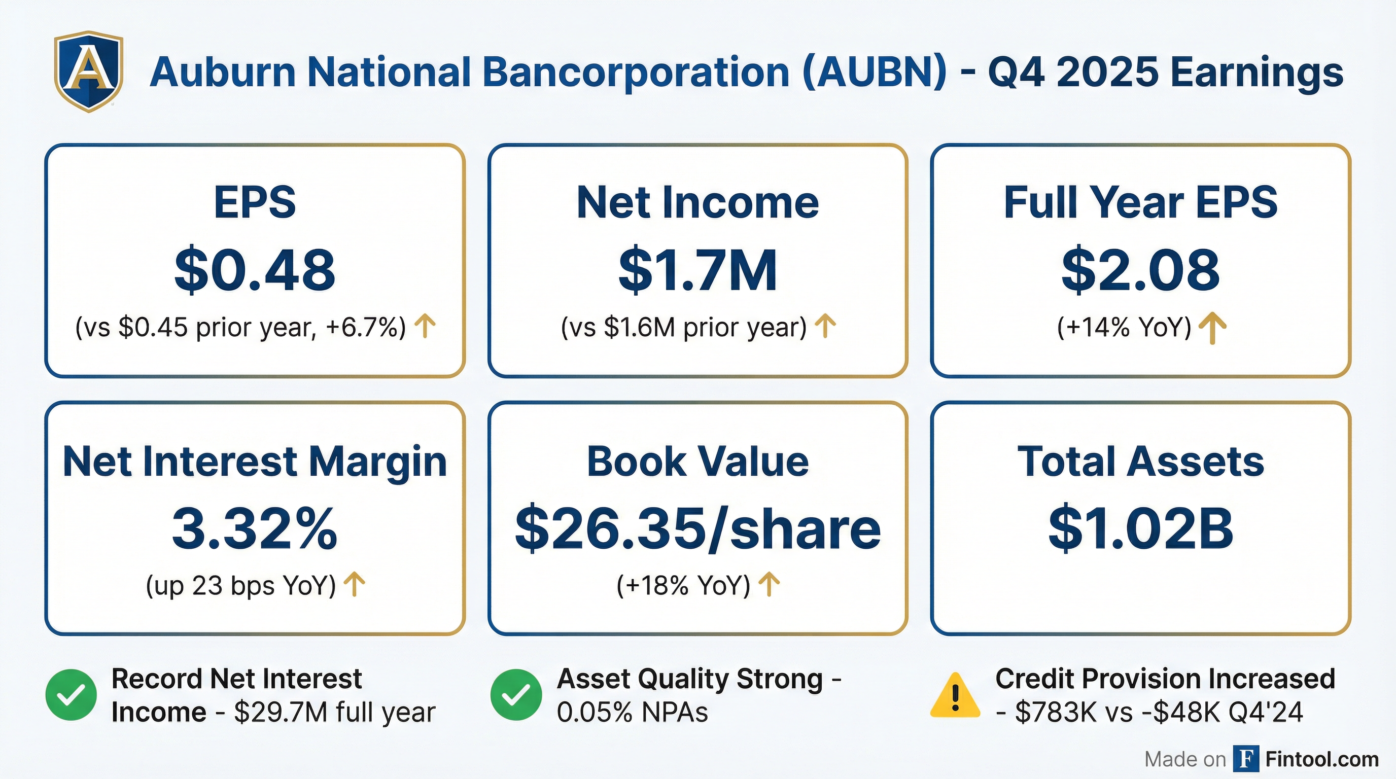 - Auburn National Bancorporation, Inc. reported net income of $1.7 million, or $0.48 per share, for the fourth quarter of 2025, and $7.3 million, or $2.08 per share, for the full year 2025.