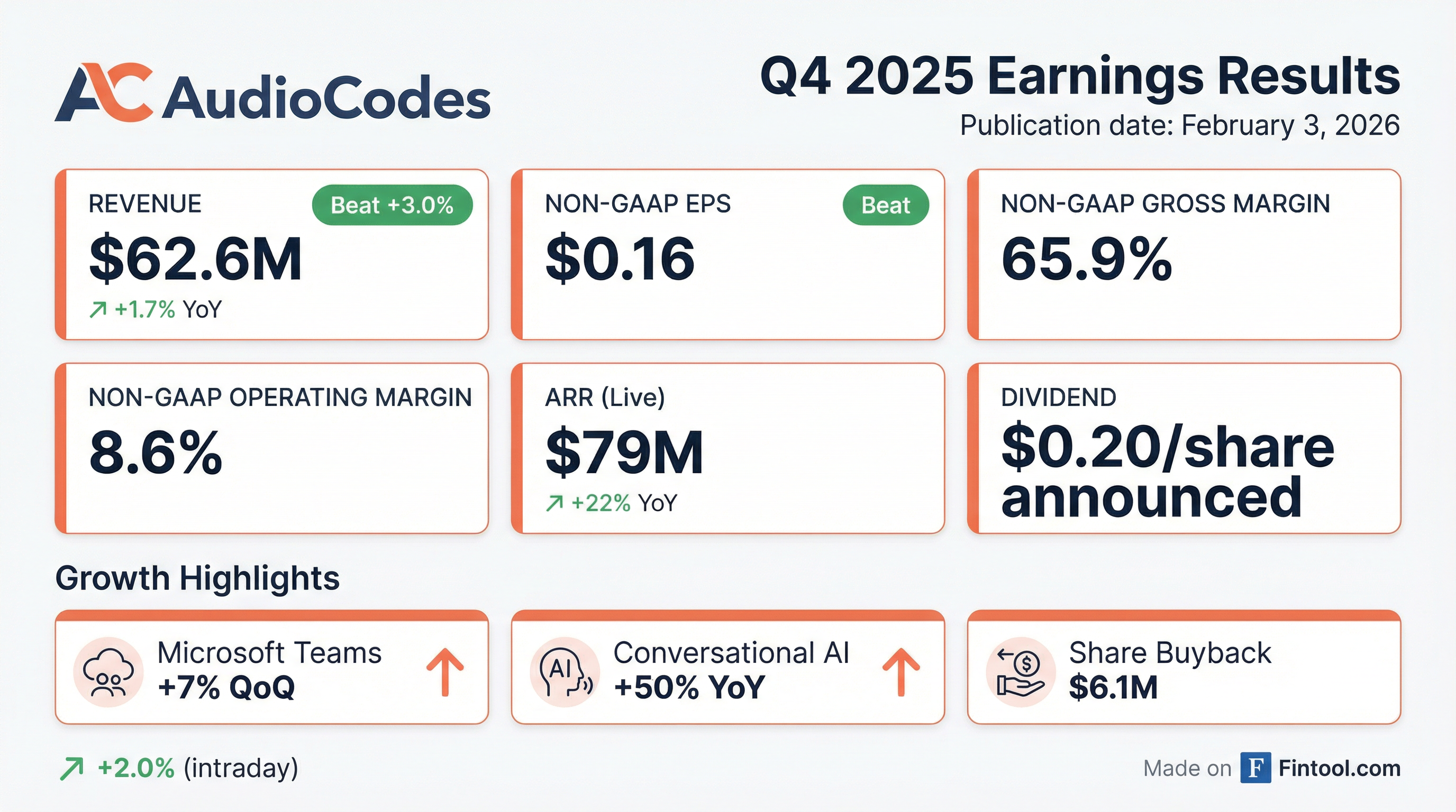 - AudioCodes declared a cash dividend of $0.20 per share and repurchased 667,000 ordinary shares for approximately $6.1 million during Q4 2025.