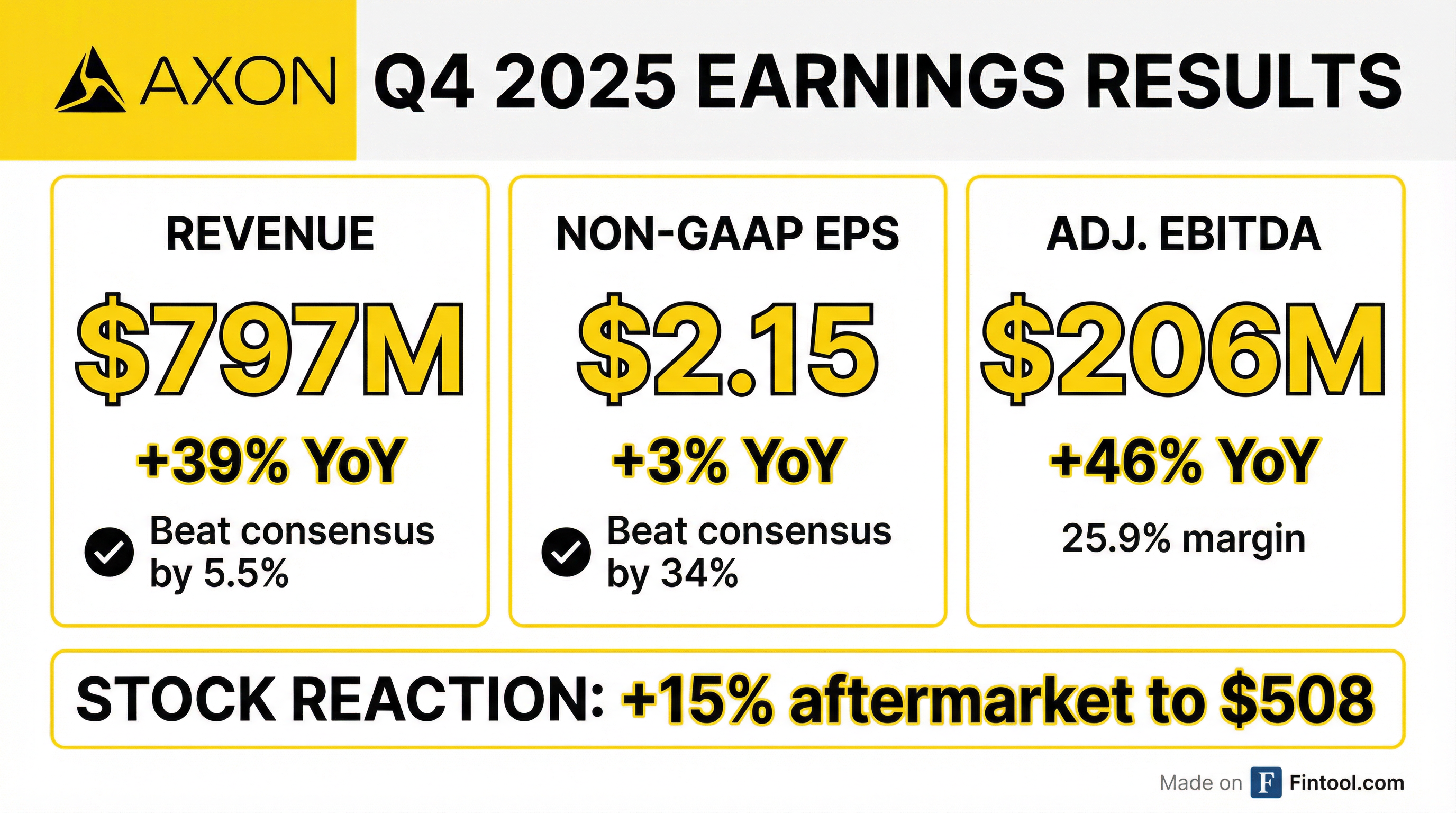 - Axon delivered $797 million in Q4 revenue, up 39% year-over-year, driven by software & services revenue of $343 million (+40% YoY) and connected devices revenue of $454 million (+38% YoY); net revenue retention expanded to 125% and ARR grew 35% to over $1.3 billion.