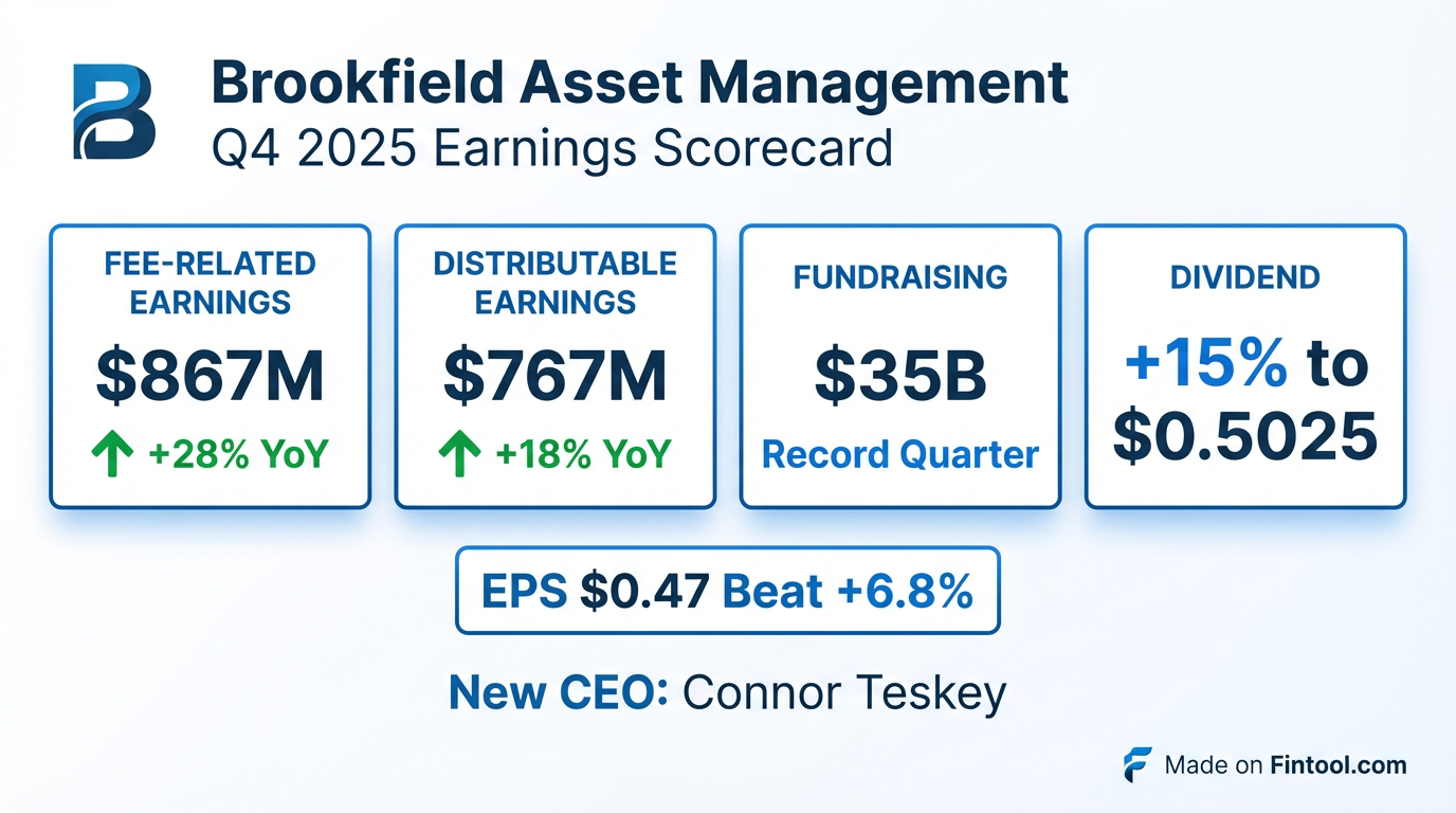- Brookfield Asset Management reported record fee-related earnings (FRE) of $3 billion for 2025, a 22% increase year-over-year, with distributable earnings (DE) reaching $2.7 billion, up 14%. For Q4 2025, FRE was $867 million ($0.53 per share) and DE was $767 million ($0.47 per share).