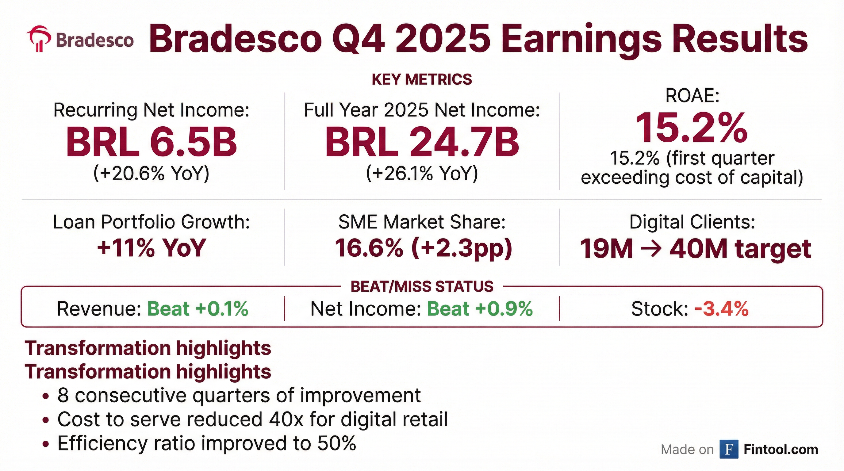 - Bradesco reported a net income of R$6.5 billion in 4Q25, contributing to a R$24.7 billion profit for the full year 2025, marking a 26.1% growth compared to 2024 and achieving a Return on Average Equity (ROAE) of 15.2% in 4Q25.