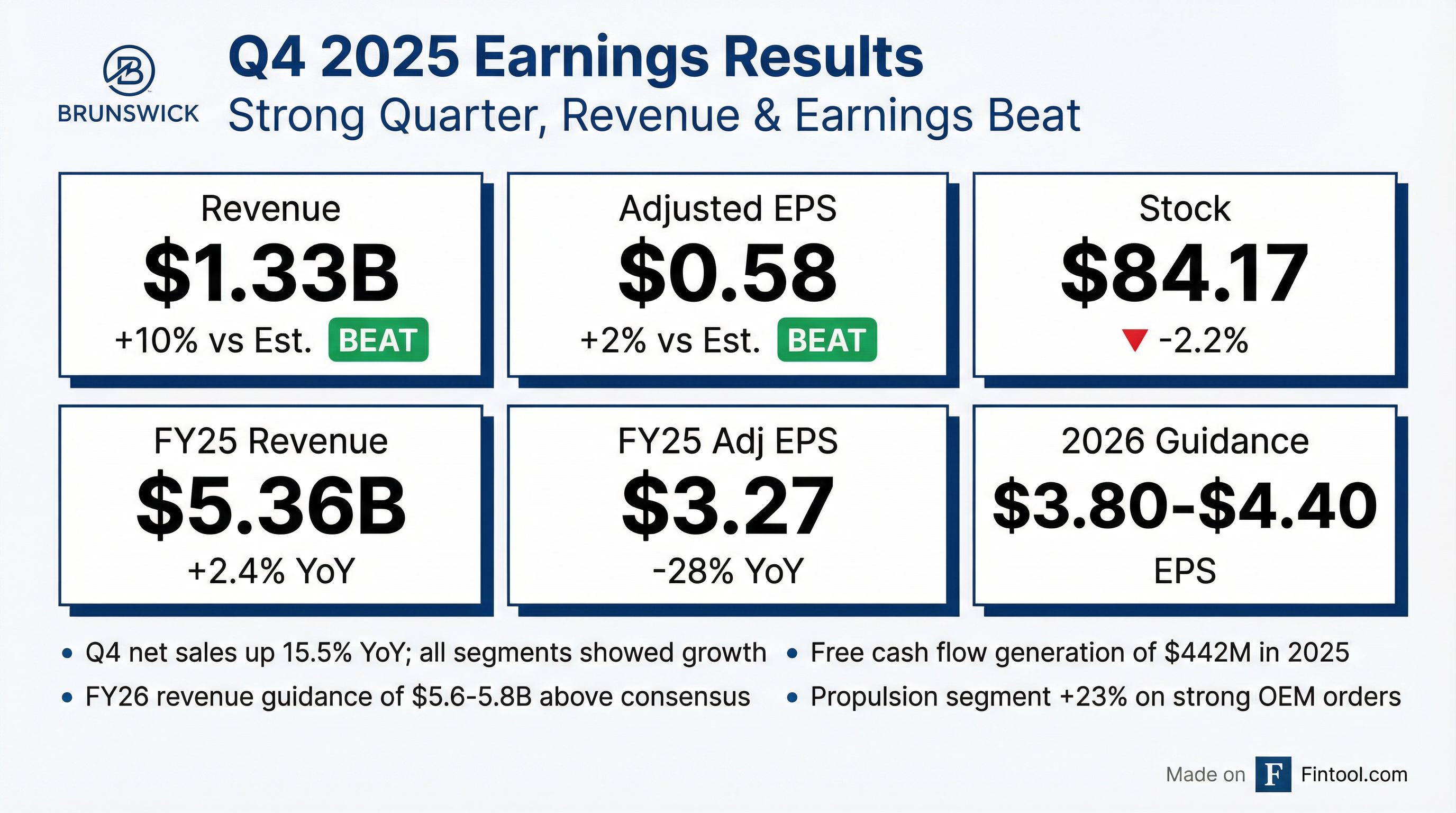 - Brunswick Corporation reported full-year 2025 net sales of $5.363 billion, a 2% increase from 2024, with adjusted diluted EPS of $3.27, a 28% decrease from 2024, and free cash flow of $442 million, an increase of $158 million compared to 2024.