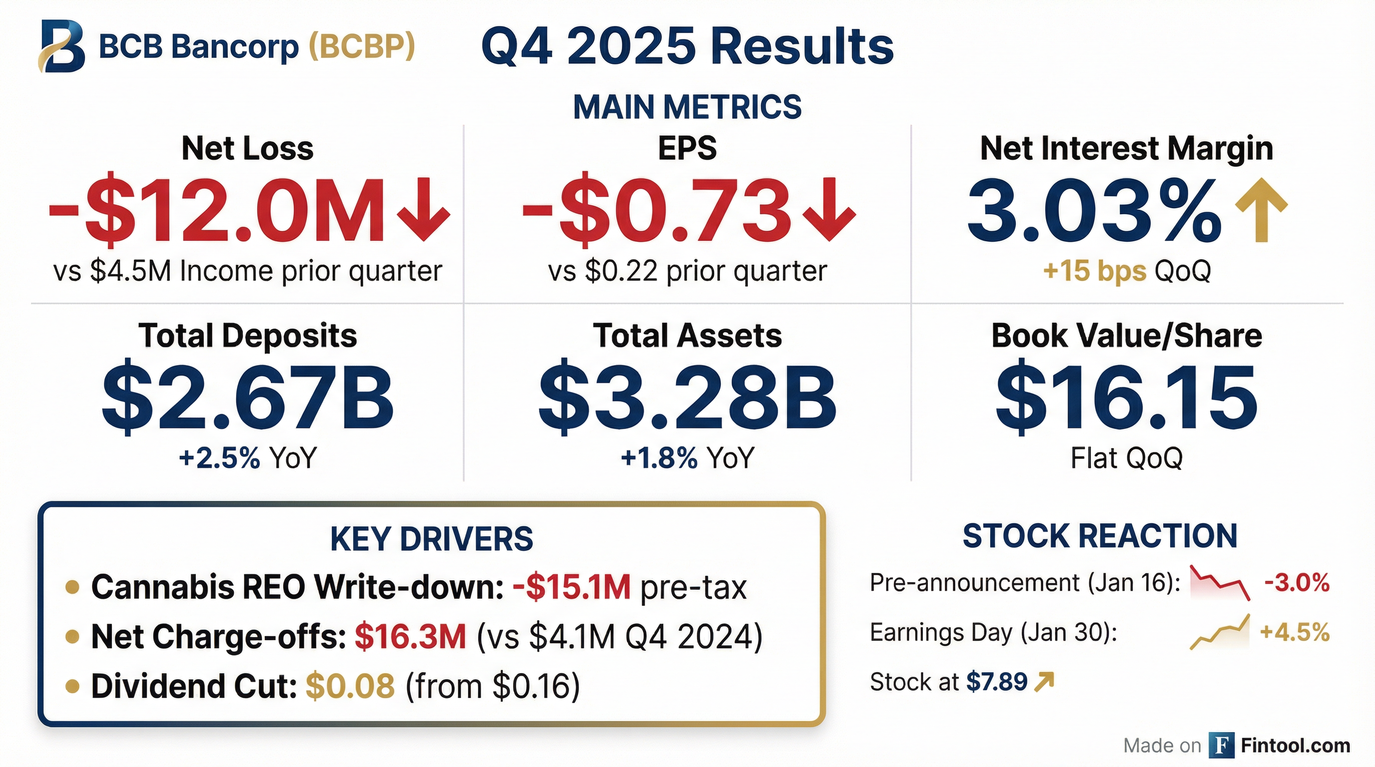 - BCB Bancorp reported a net loss of $12.0 million for the fourth quarter of 2025, compared to net income of $4.3 million in the third quarter of 2025, and a loss per diluted share of ($0.73).