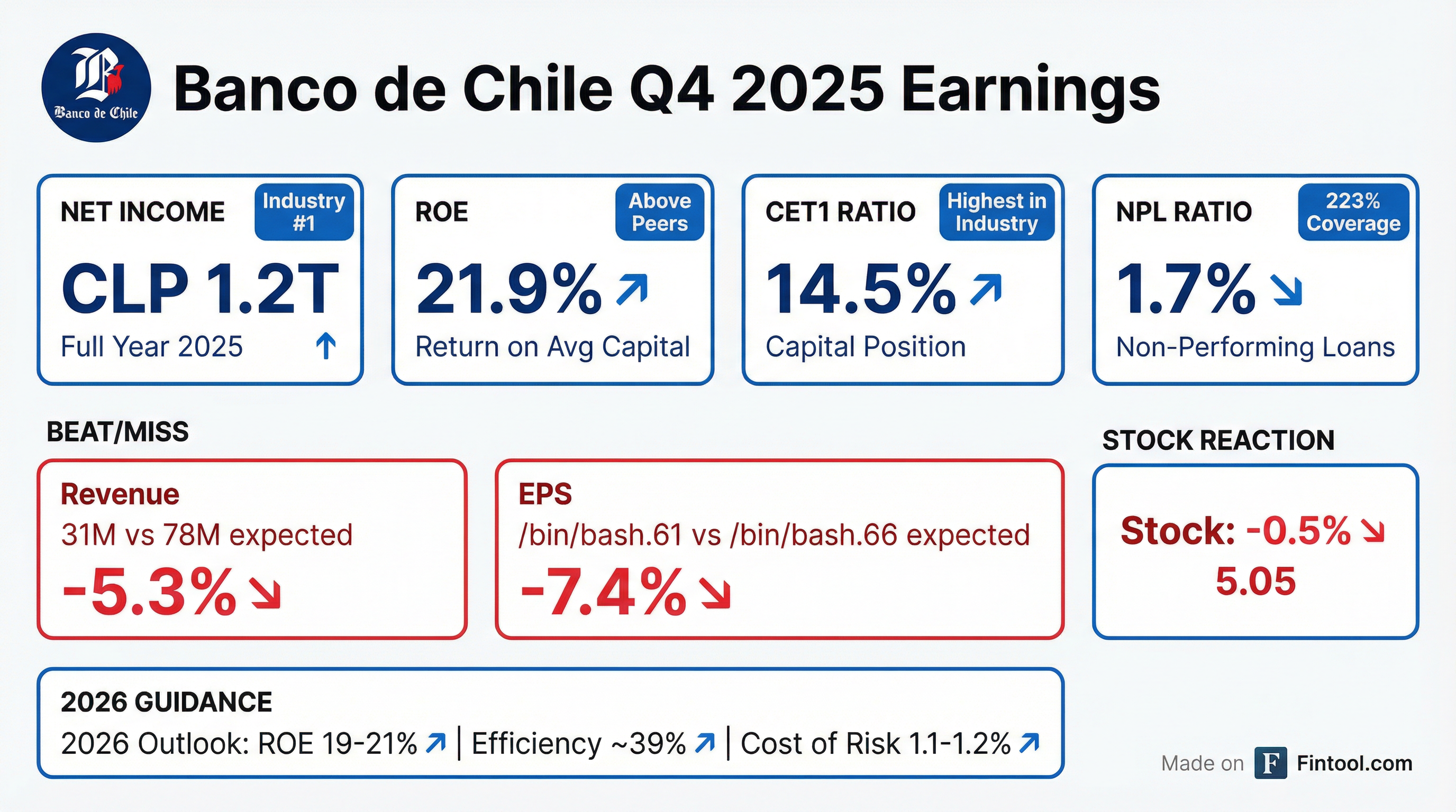 - Banco de Chile reported a net income of CLP 1.2 trillion and a 2.2% return on average assets for the full year 2025, leading the local banking industry in profitability.