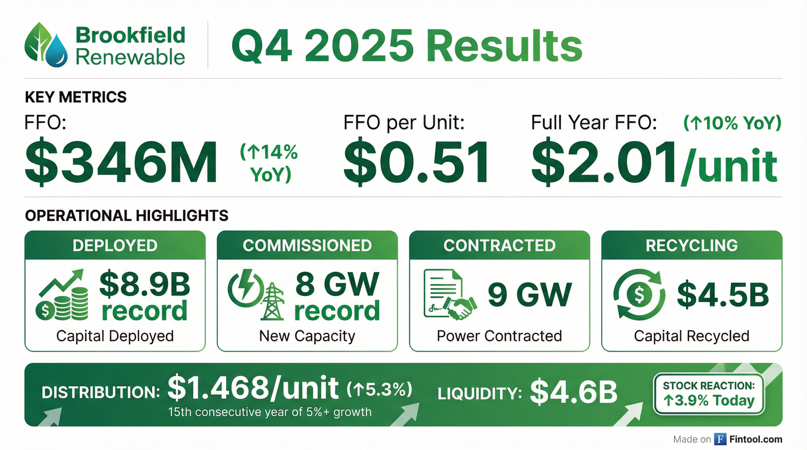 - The company deployed or committed a record $8.9 billion in growth capital, highlighted by the privatization of Neoen and carve-out of Geronimo Power, and generated record asset recycling proceeds of $4.5 billion.