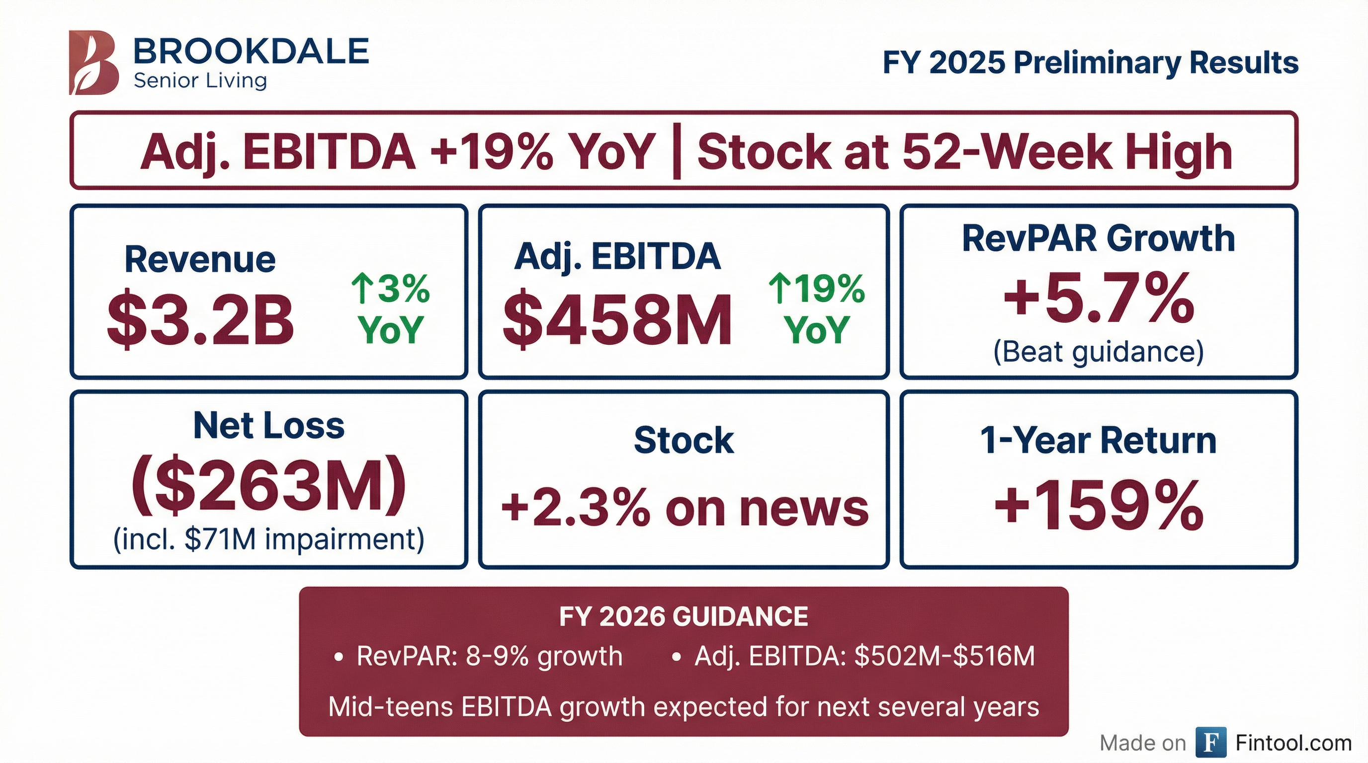 - Brookdale Senior Living announced preliminary full-year 2025 results, reporting revenue of approximately $3.2 billion, a net loss of approximately $263 million, and Adjusted EBITDA of approximately $458 million, which represents an approximate 19% increase from the prior year.