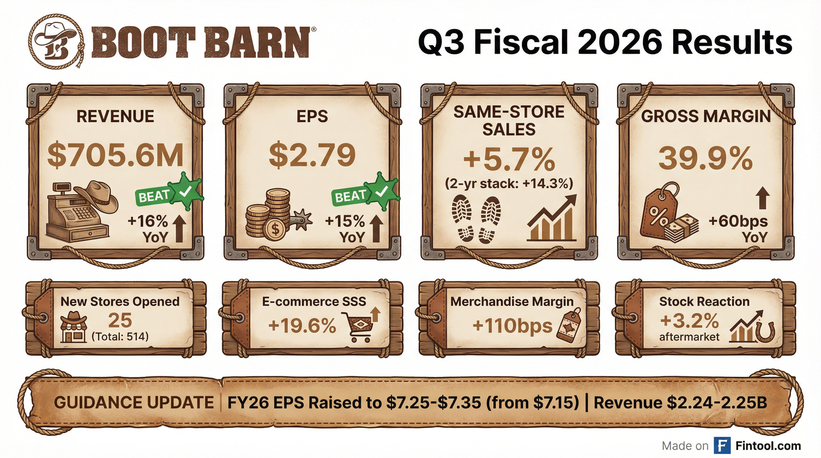 - Boot Barn Holdings Inc. reported strong Q3 2026 results, with revenue increasing 16% to $706 million and earnings per diluted share reaching $2.79. Consolidated same-store sales grew 5.7%, driven by a 3.7% increase in retail store sales and a 19.6% increase in e-commerce sales.