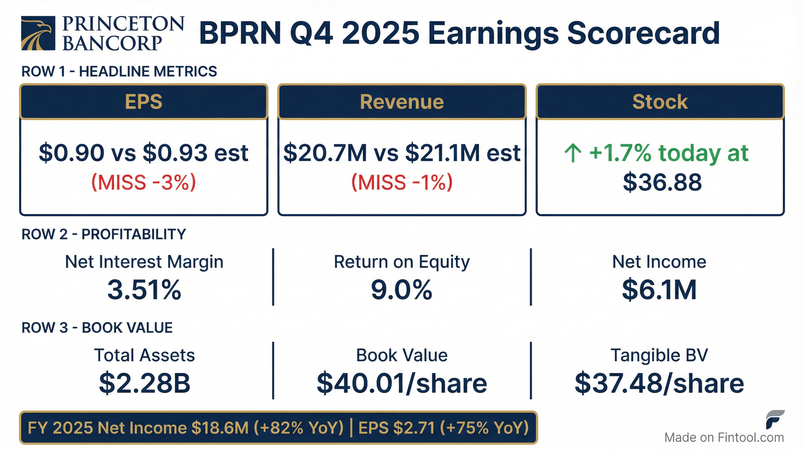 - Princeton Bancorp reported net income of $6.1 million and diluted EPS of $0.90 for the fourth quarter of 2025, which is a decrease from $6.5 million and $0.95, respectively, in Q3 2025, but an increase from $5.2 million and $0.75 in Q4 2024.