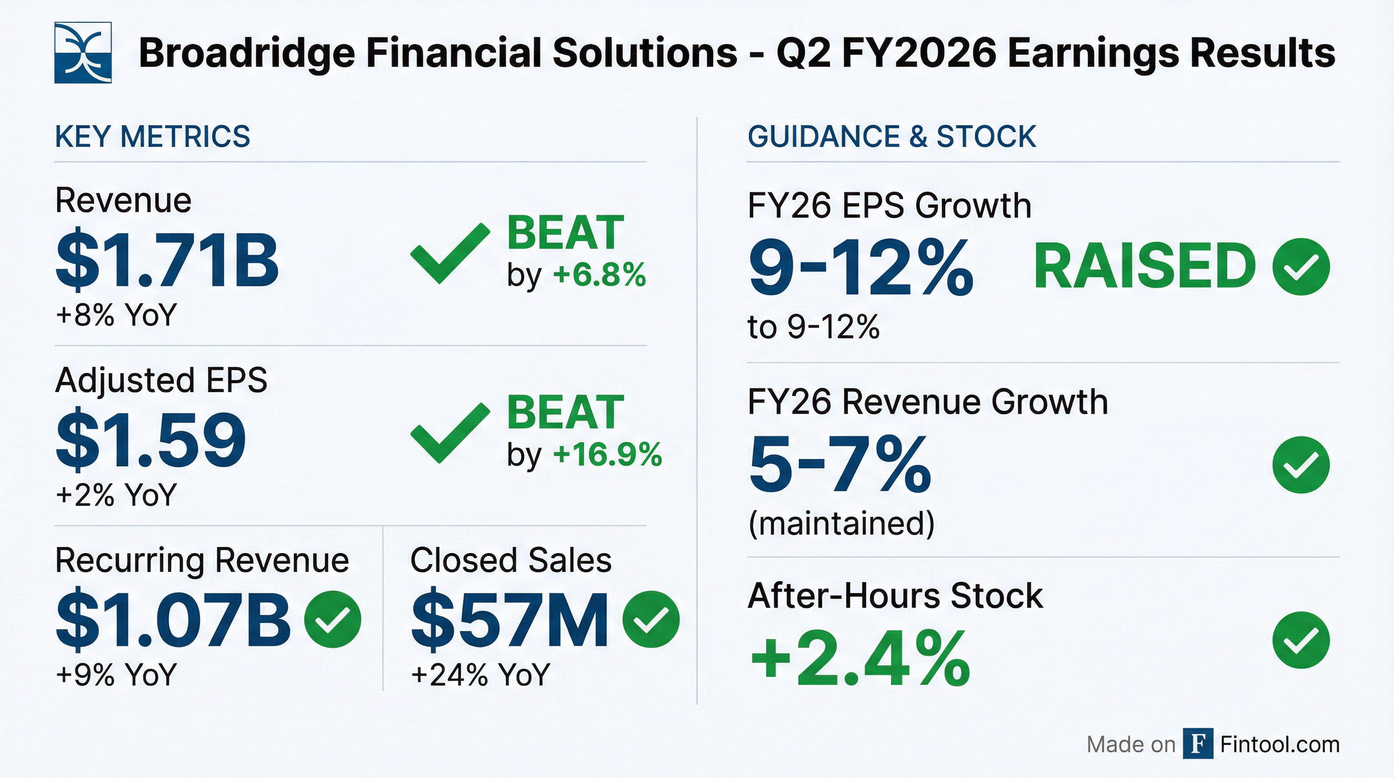 - Broadridge reported revenue of $1.71 billion and adjusted EPS of $1.59, surpassing consensus.