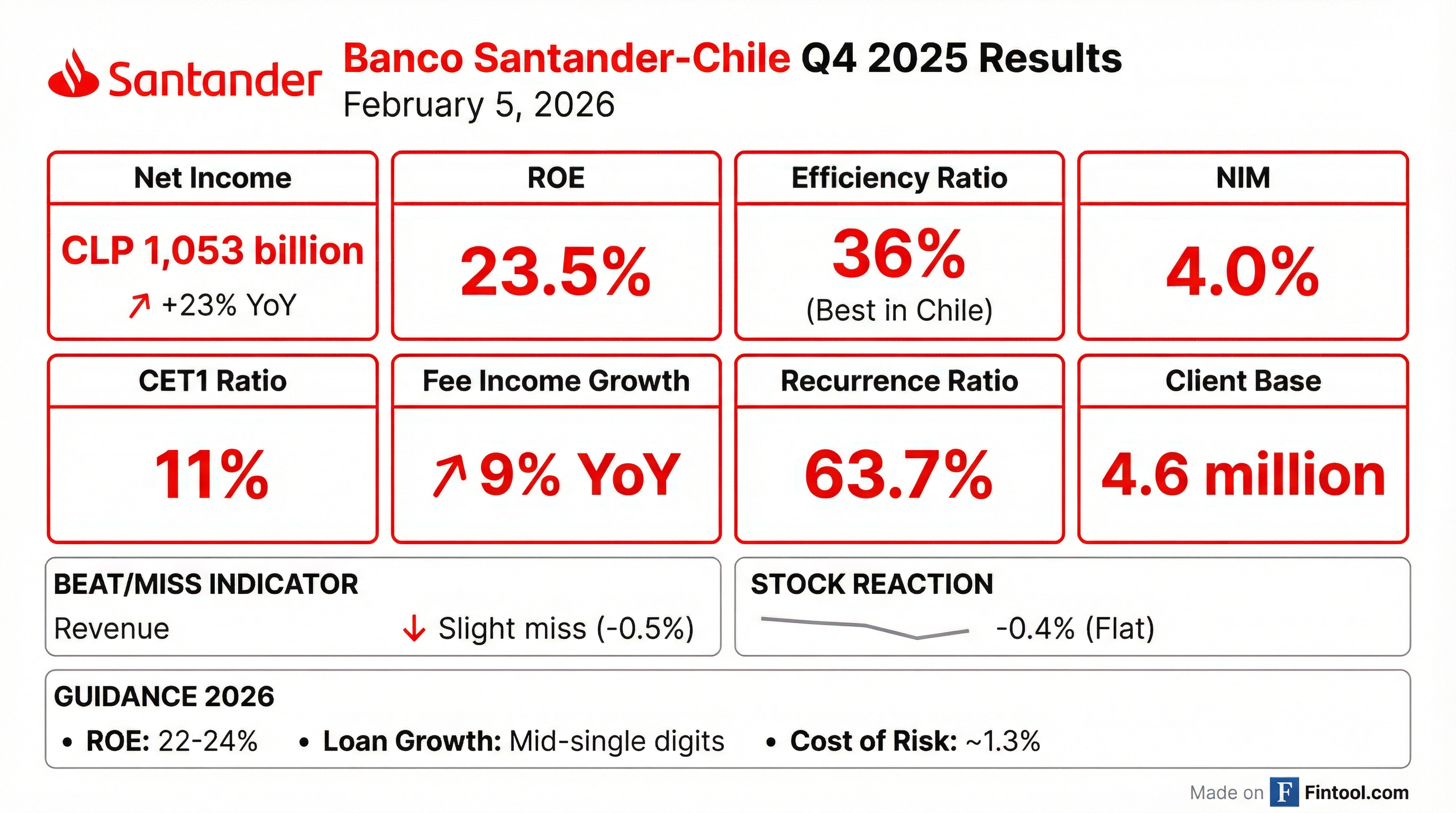 • Banco Santander-Chile reported a 23% year-over-year increase in net income to CLP 1,053 billion for 2025, achieving a return on average equity (ROE) of 23.5% and an efficiency ratio of 36%.