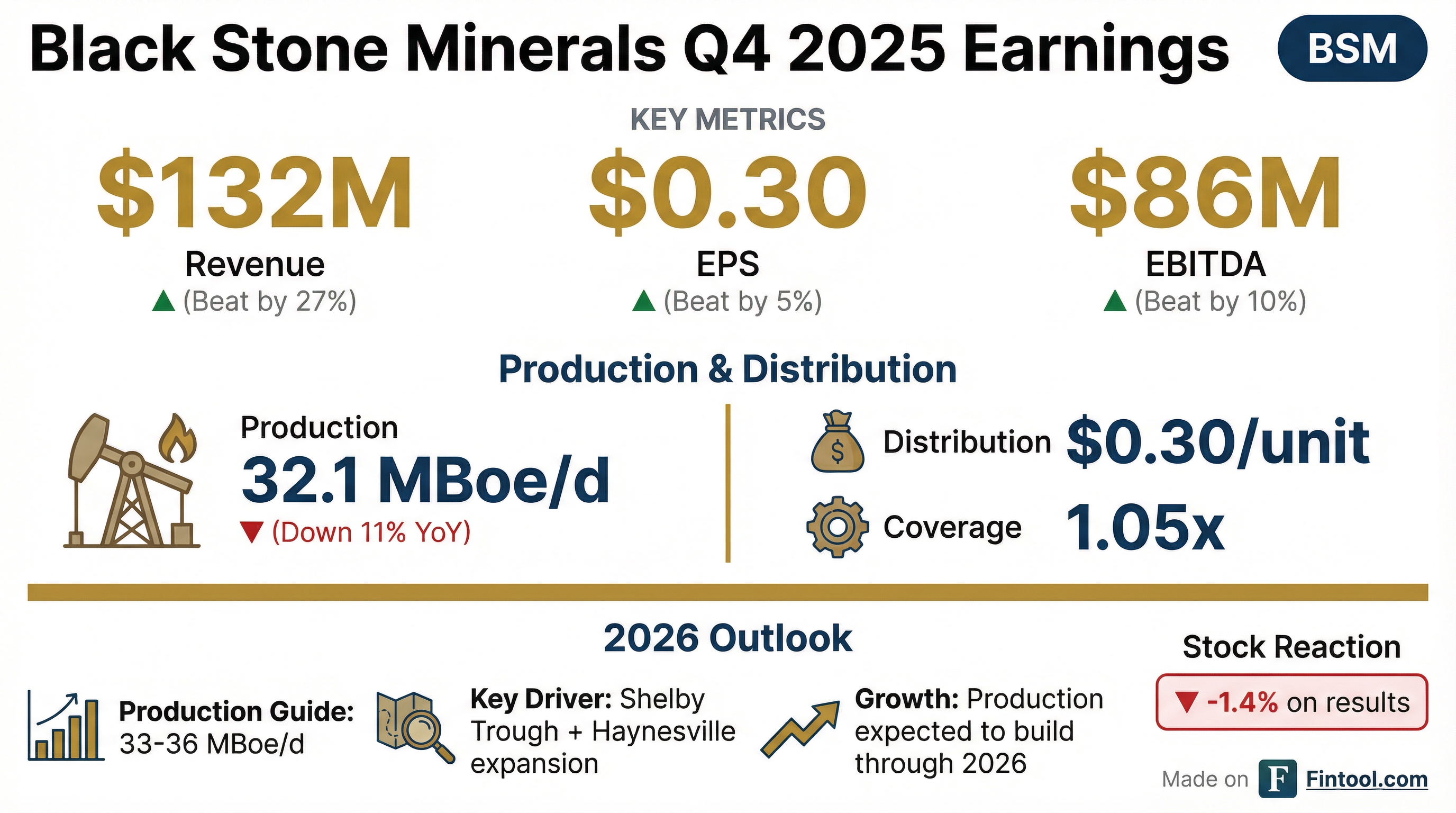 - Black Stone Minerals reported Q4 2025 net income of $72.2 million, adjusted EBITDA of $76.7 million, and distributable cash flow of $66.8 million, supporting a $0.30 per unit distribution with 1.05x coverage.