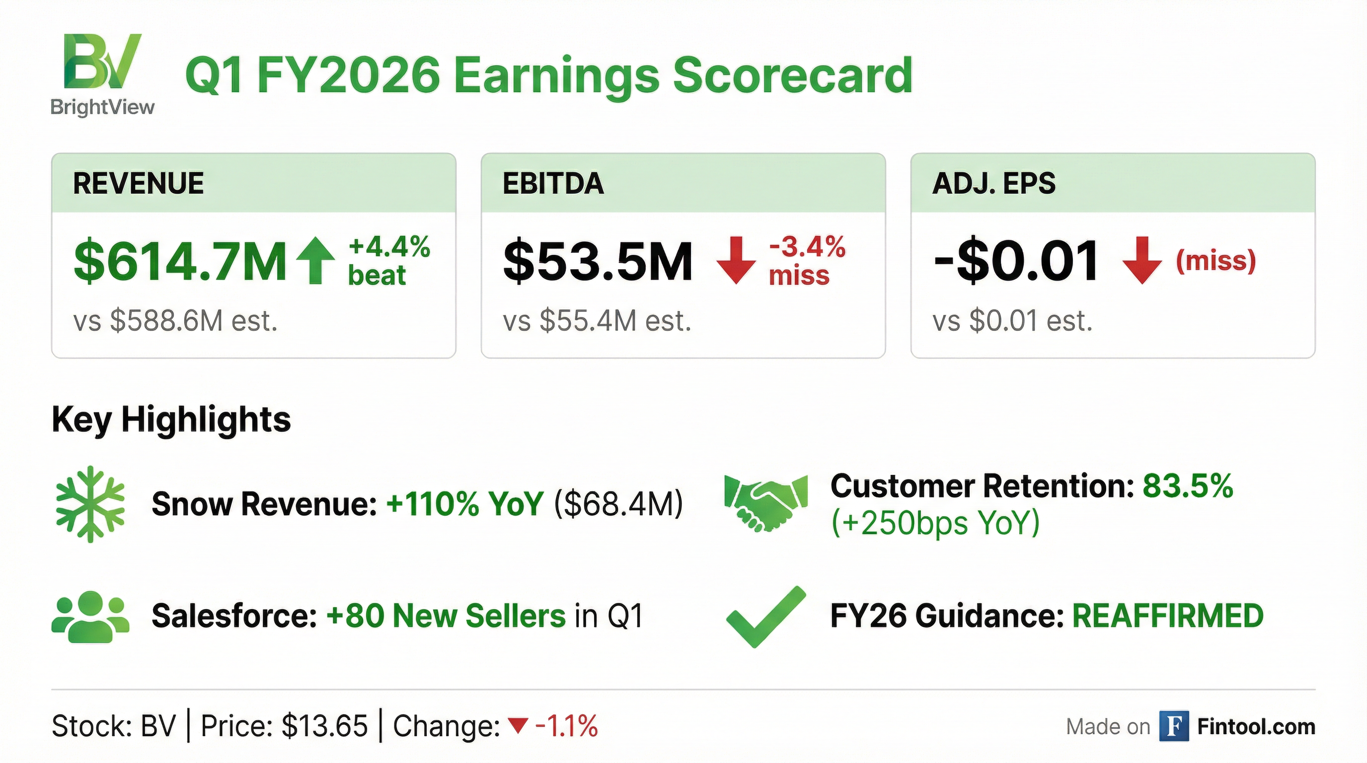- BrightView (BV) reported Q1 2026 total revenue of $615 million, a 3% increase year-over-year, driven by heightened snowfall and improved underlying land metrics, and delivered Adjusted EBITDA growth.