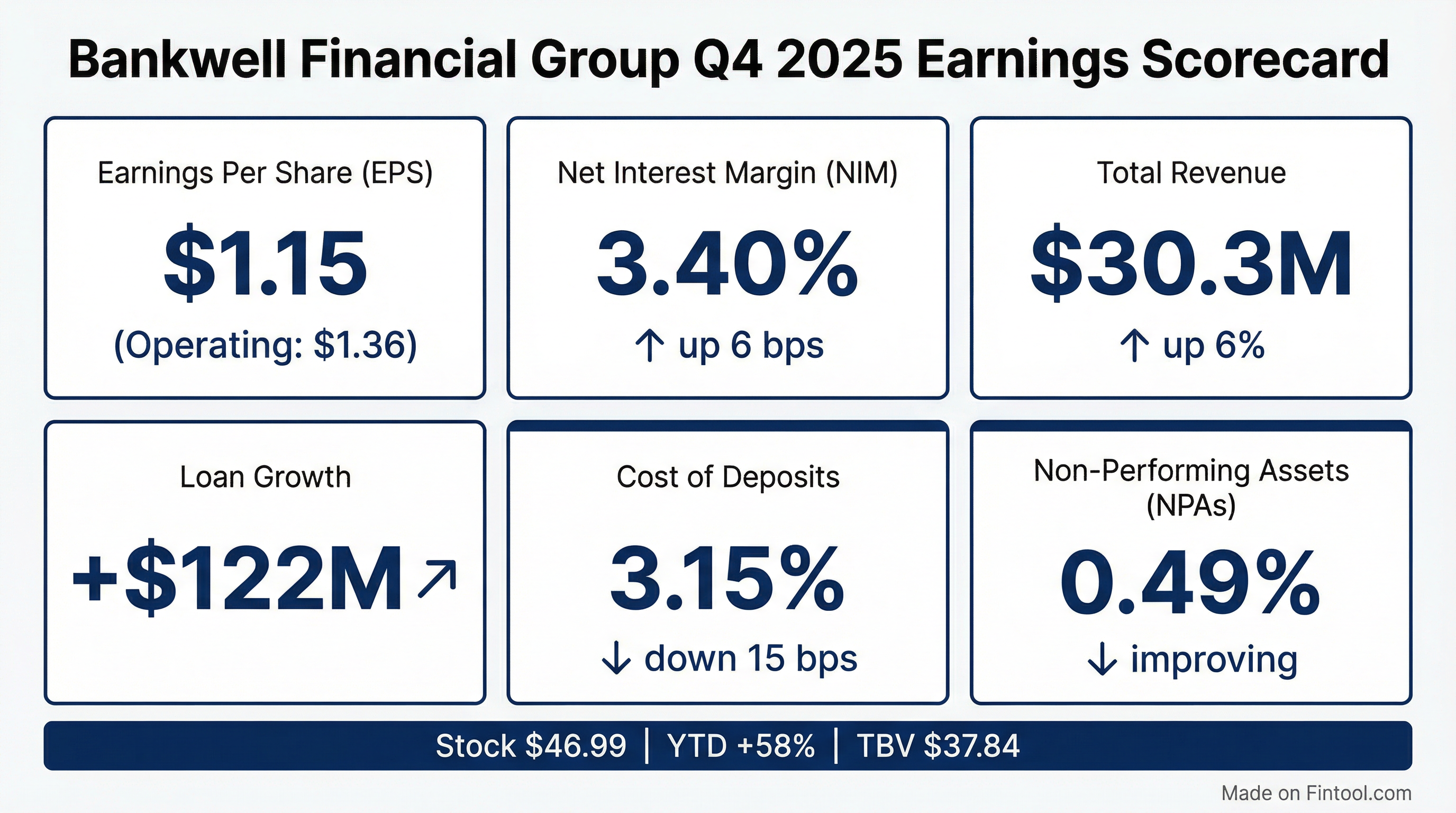 - Bankwell Financial Group (BWFG) reported fully diluted EPS of $1.15, or $1.36 on an operating basis, for Q4 2025.