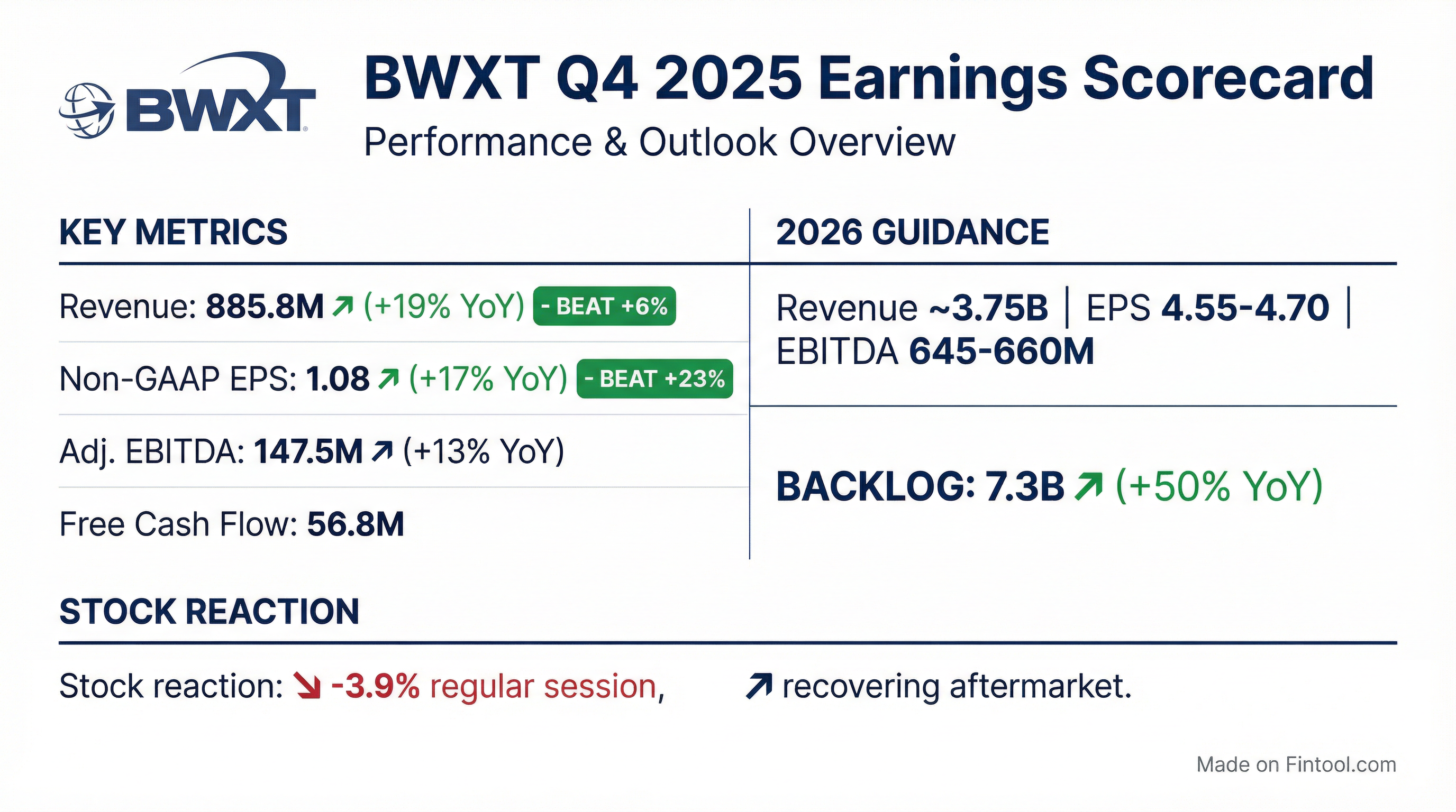- BWX Technologies reported Q4 2025 revenue of $885.8 million and non-GAAP EPS of $1.08, which beat estimates by $0.20.