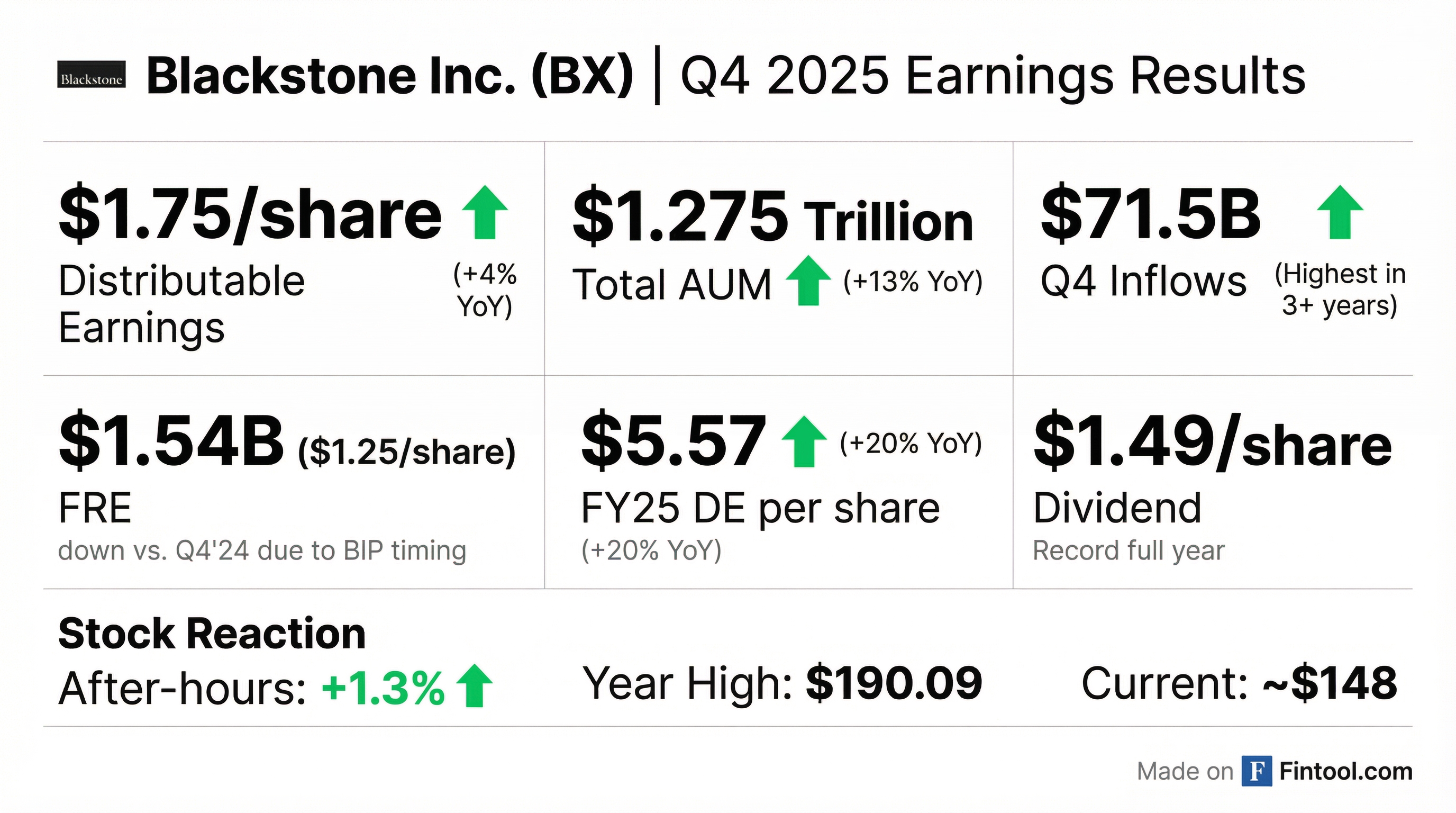 - Blackstone posted Q4 GAAP net income of $1.97 billion (EPS $1.30) and Q4 distributable earnings of $2.24 billion ($1.75/share).