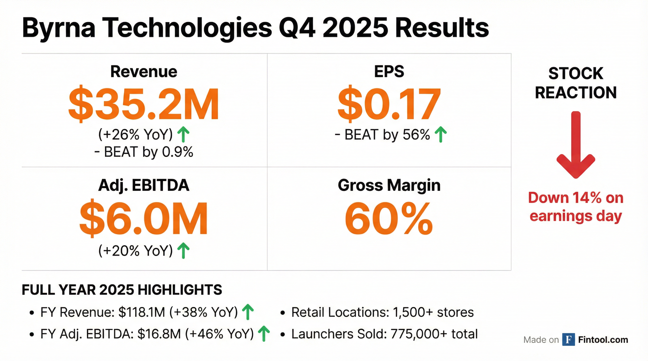 • Byrna Technologies Inc. reported Q4 2025 net revenue of $35.2 million, a 26% increase year-over-year, and full-year 2025 net revenue of $118.1 million, up 38% from 2024. Full-year Adjusted EBITDA grew to $16.8 million from $11.5 million in the prior year.