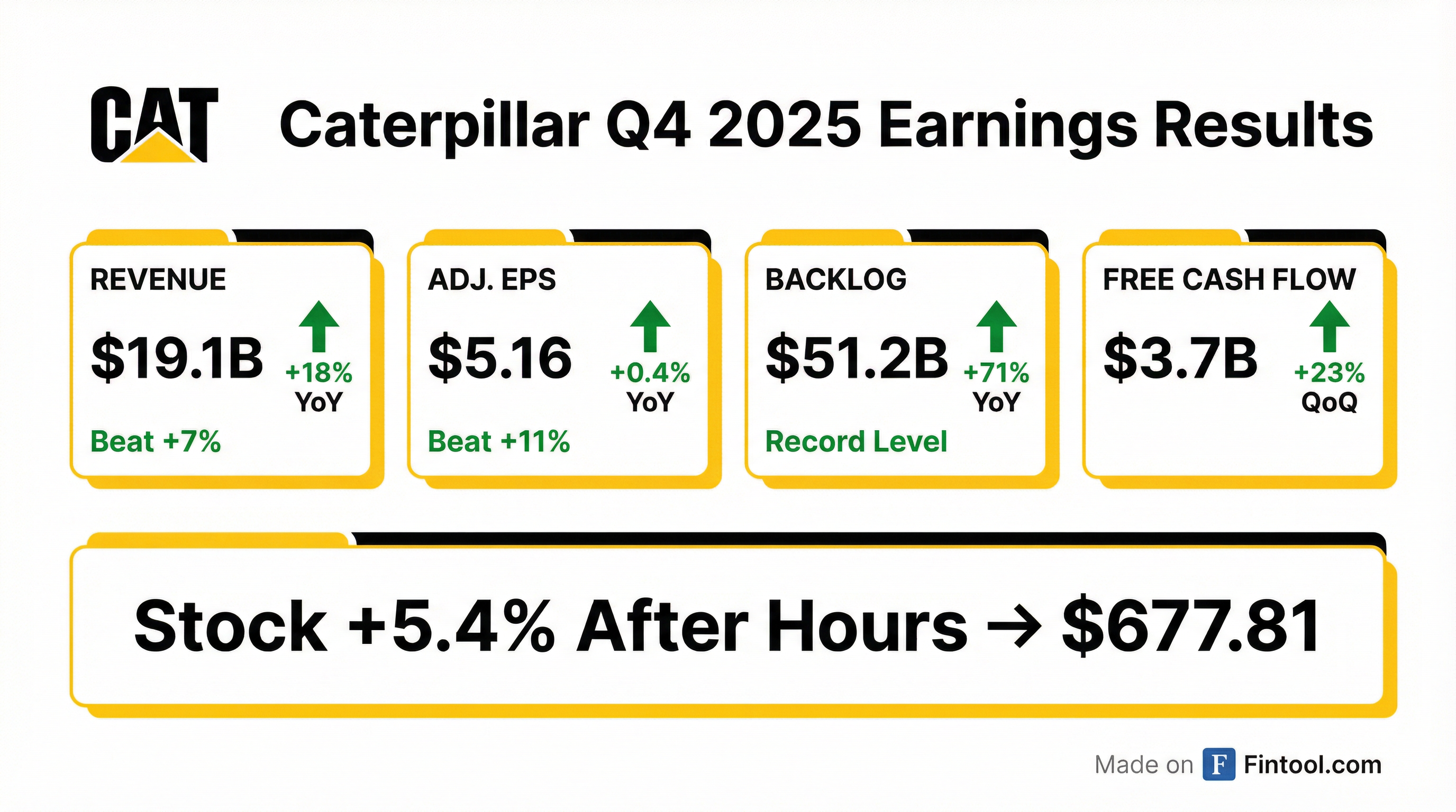 - Caterpillar delivered fourth-quarter sales and revenues of $19.1 billion, up 18% year-over-year, and full-year revenues of $67.6 billion, a 4% increase.