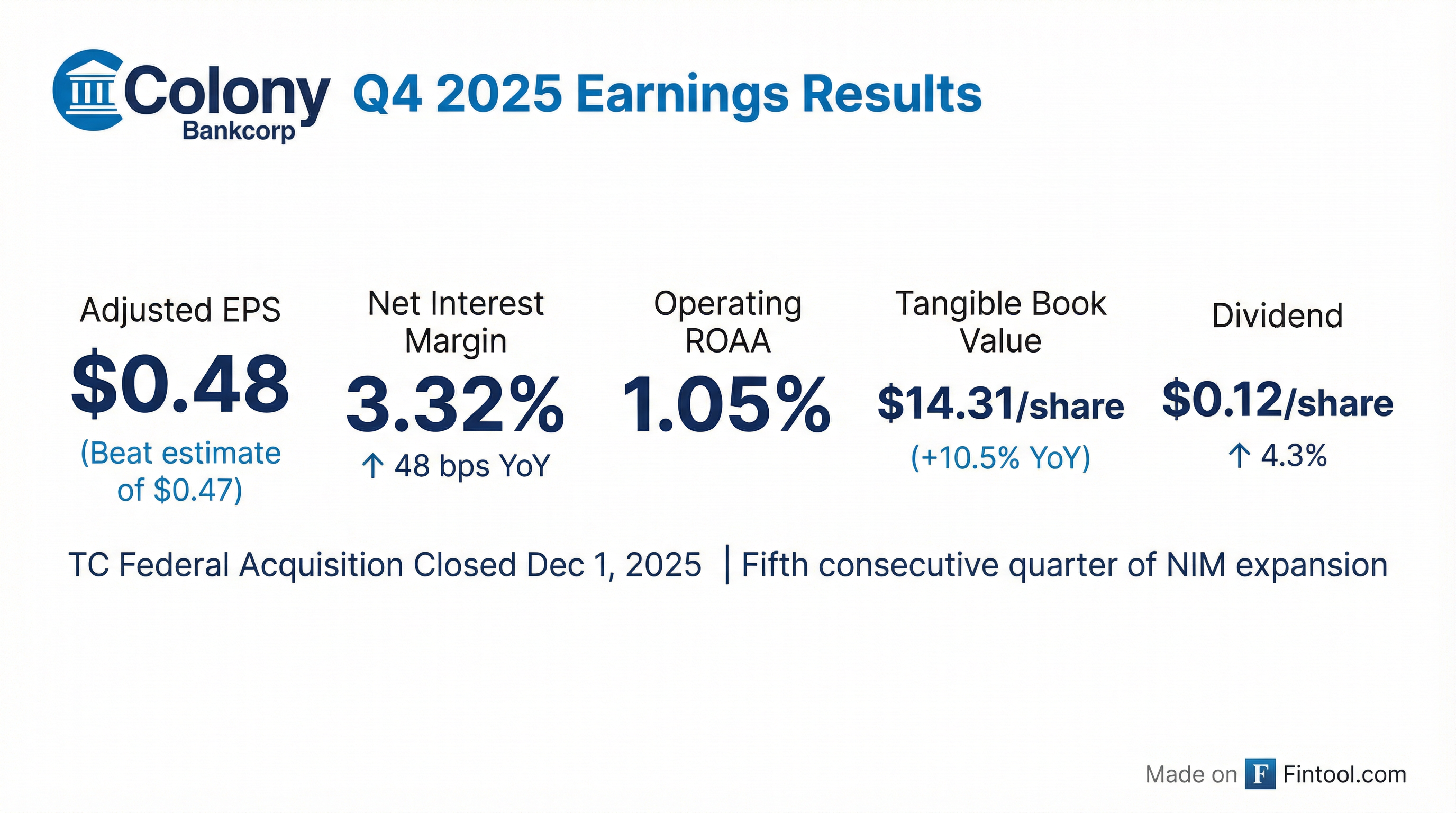 - Colony Bankcorp reported a strong fourth quarter of 2025, with operating net income increasing by $675,000 compared to the third quarter, and achieved a 1% operating ROA for the 2025 fiscal year. Net interest margin increased 15 basis points to 3.32% in the quarter.