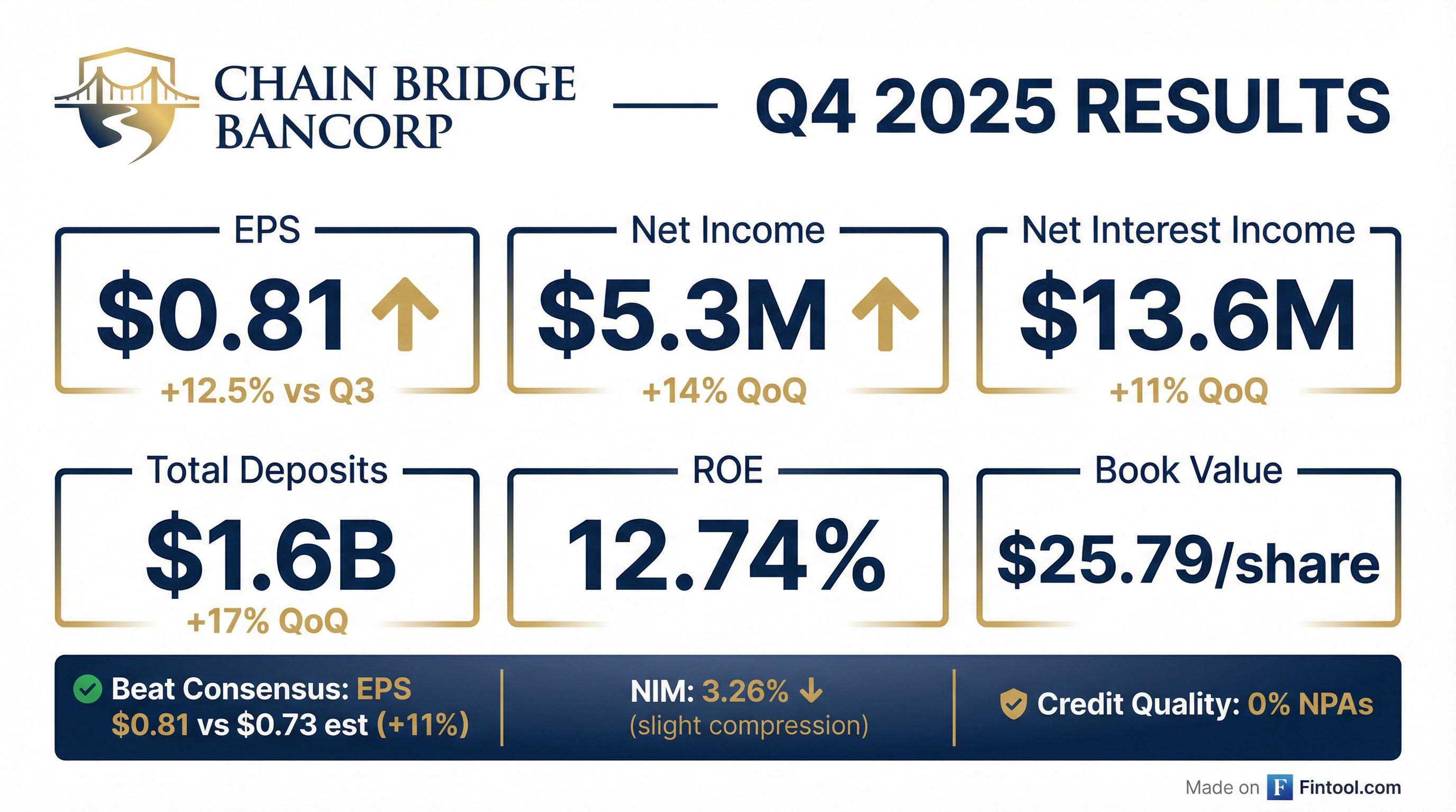 - Chain Bridge Bancorp, Inc. reported net income of $5.3 million and earnings per share of $0.81 for the fourth quarter of 2025, an increase from $4.7 million and $0.72 in the third quarter of 2025, and $3.7 million and $0.59 in the fourth quarter of 2024.