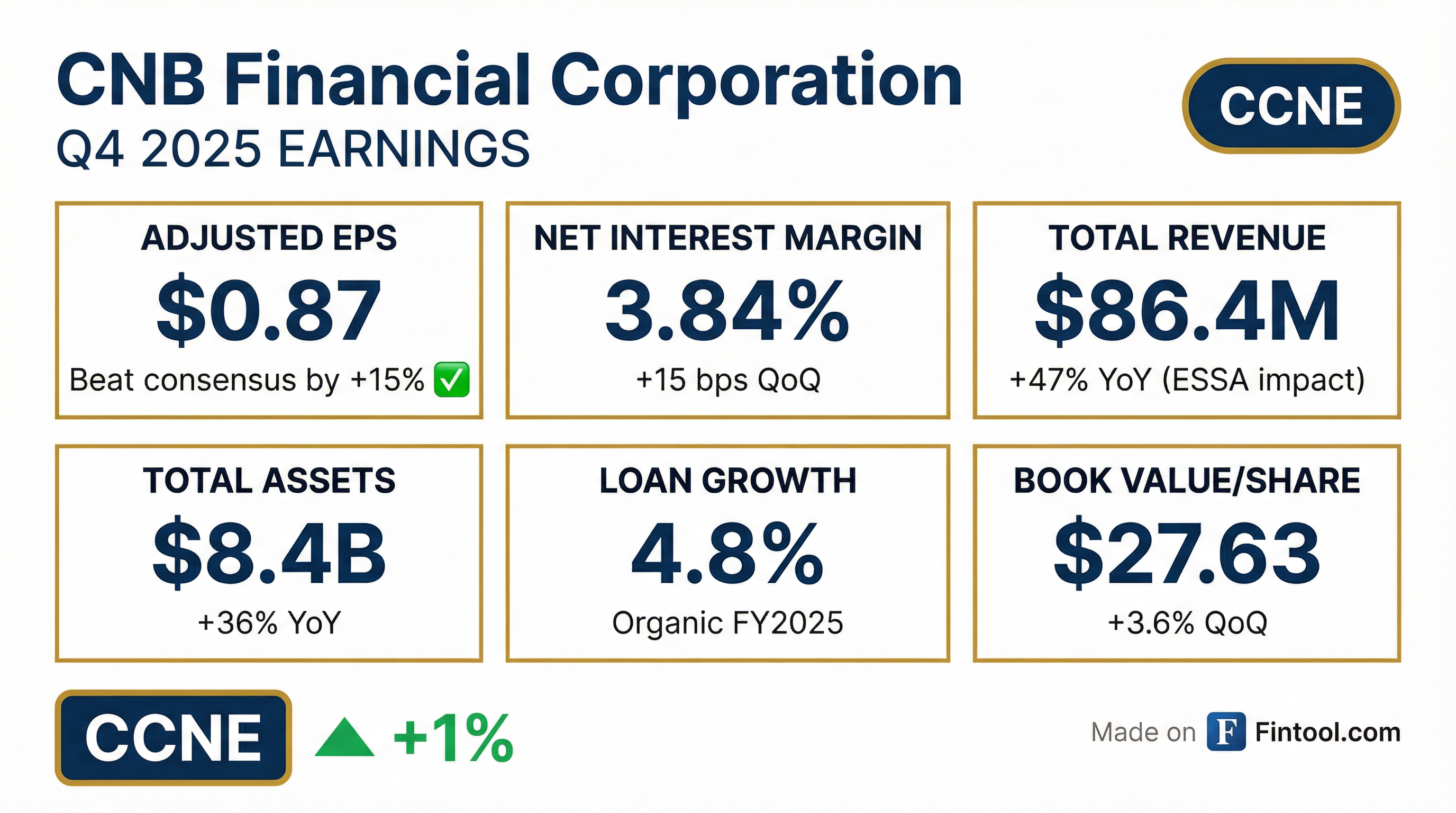 - CNB Financial Corporation completed its largest acquisition in company history, ESSA Bancorp, Inc., on July 23, 2025, which added $2.1 billion in total assets and $1.5 billion in deposits.