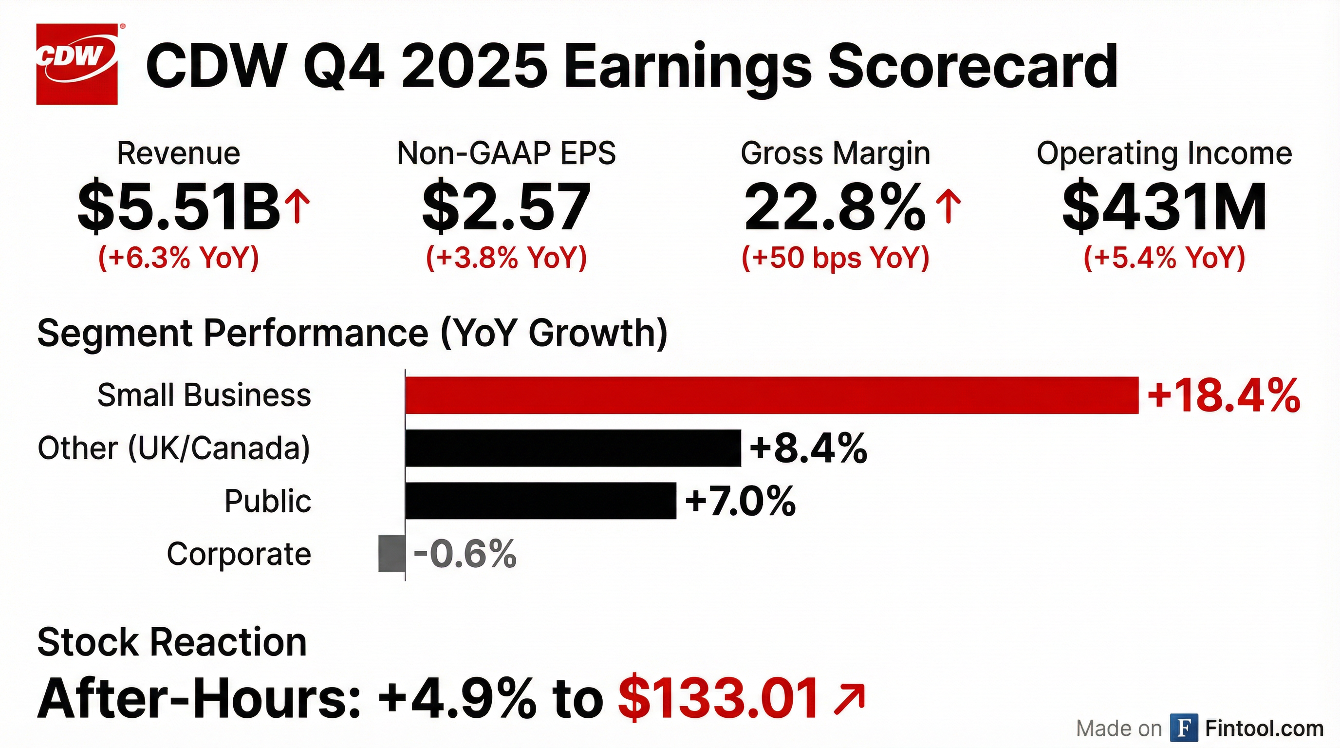 - CDW delivered $5.5 billion in net sales (up 5%), $1.25 billion in gross profit (up 9%), $503 million in non-GAAP operating income (up 1%), and $2.57 non-GAAP EPS (up 4%) in Q4 2025.