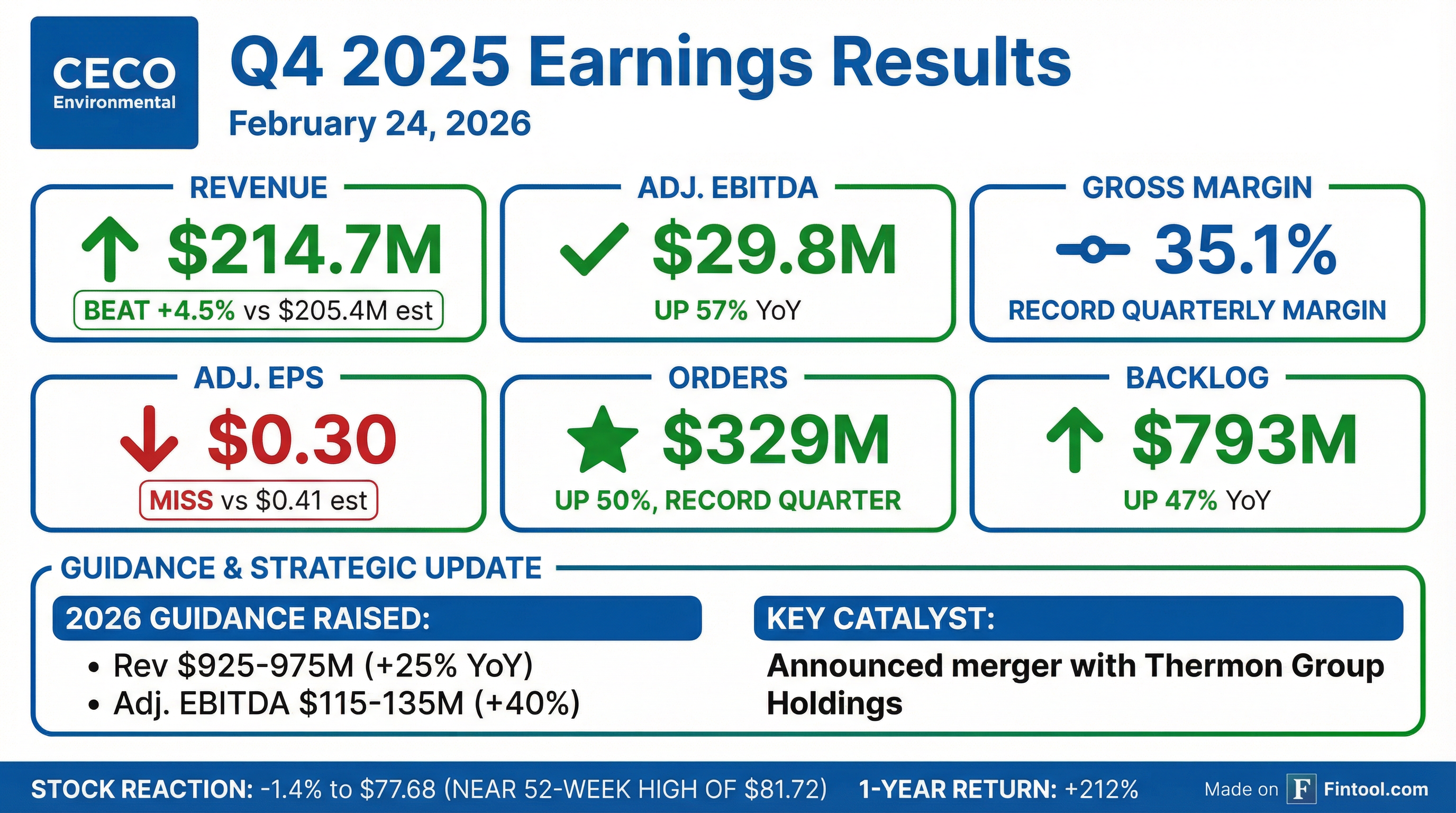 - For Q4 2025, CECO achieved $215 million in revenue (+35% year-over-year), $329 million in orders (+50% year-over-year), and $29.8 million in Adjusted EBITDA (+57% year-over-year), with an Adjusted EBITDA margin of 13.9%.