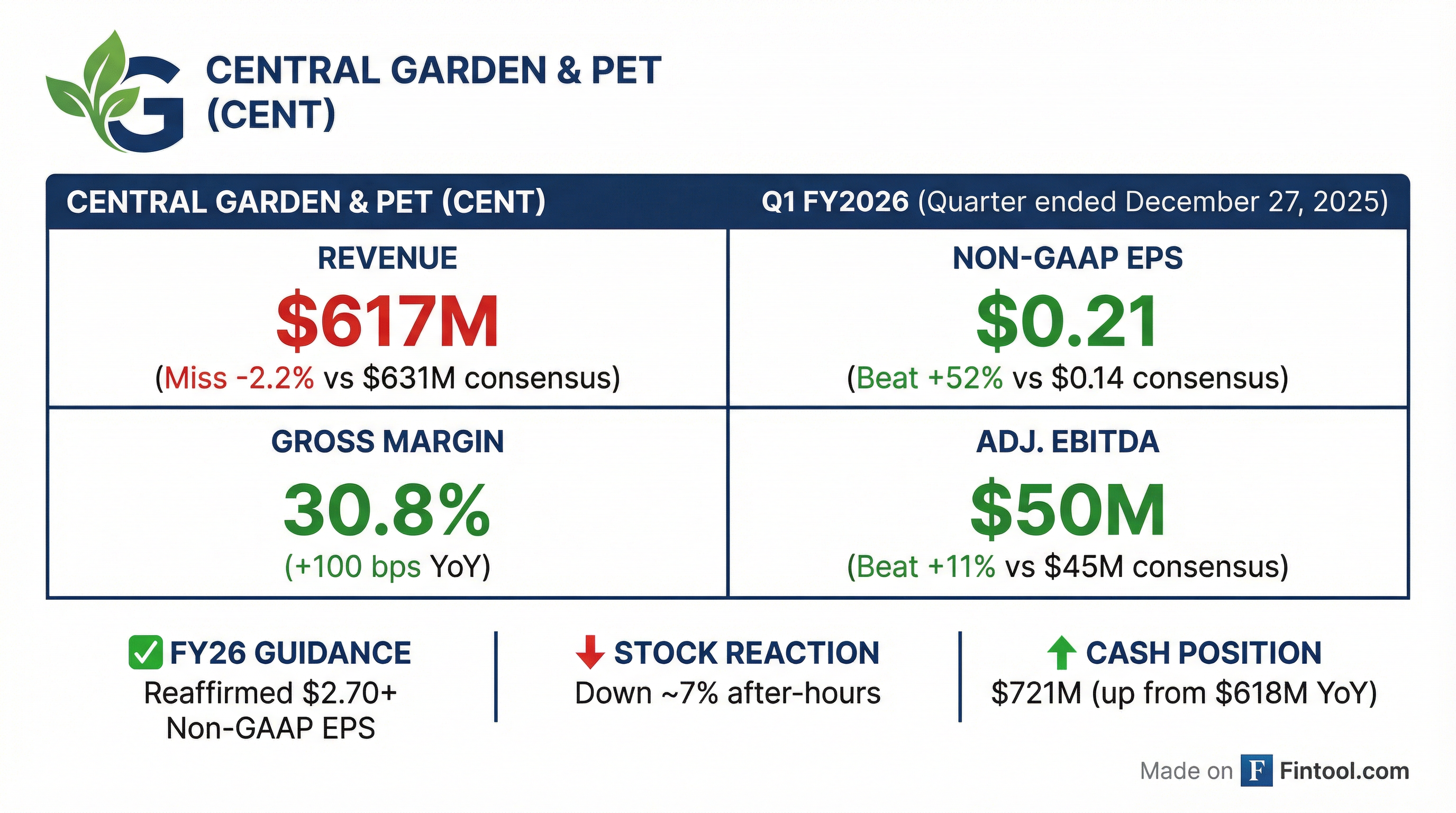 - Central Garden & Pet reported Q1 FY26 Non-GAAP EPS of $0.21, consistent with the prior year, on net sales of $617 million and an improved Non-GAAP gross margin of 30.8%.