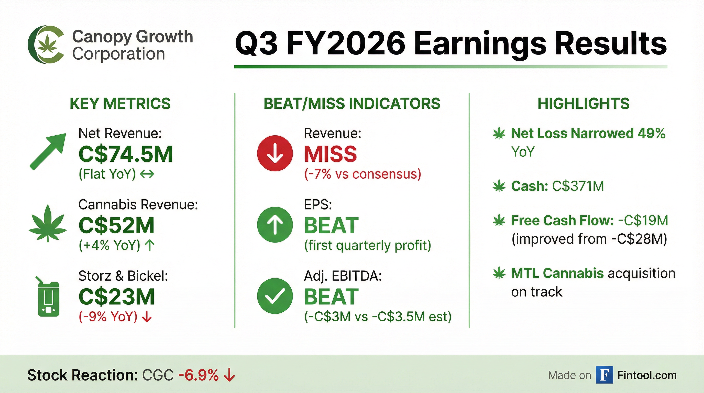 - Canopy Growth reported its narrowest Adjusted EBITDA loss to date of CAD 3 million in Q3 fiscal 2026, supported by $29 million in annualized cost savings and revenue growth across its Canadian cannabis, international cannabis, and Storz & Bickel segments.